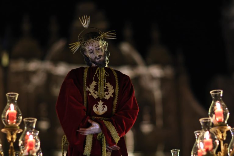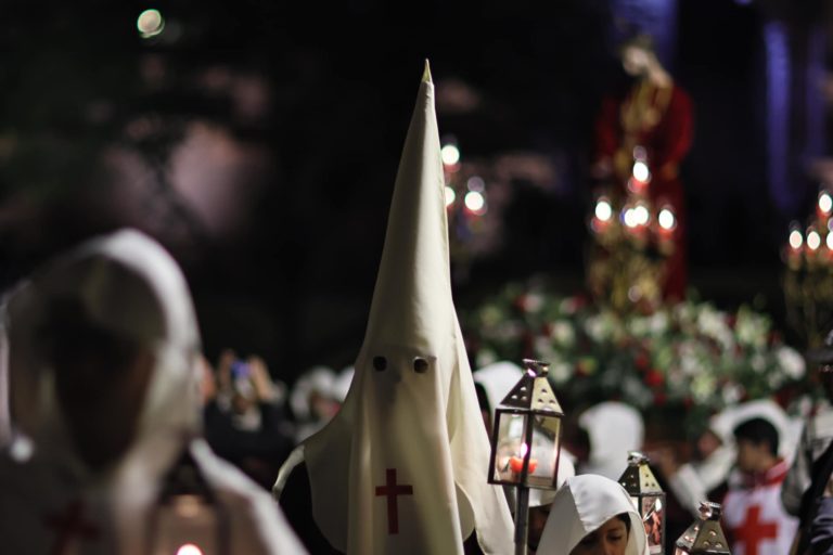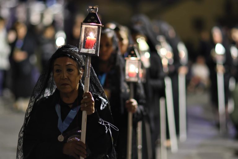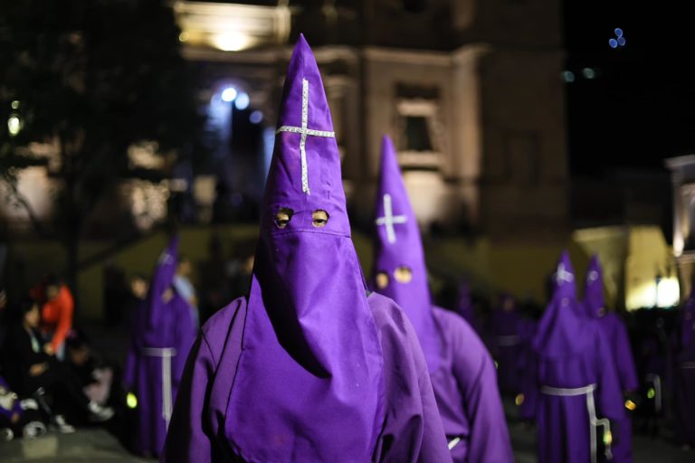 Los participantes, vestidos con túnicas negras, moradas y blancas, y portando capirotes triangulares, velas y estandartes, sumergen la ciudad en un ambiente de recogimiento y fe.