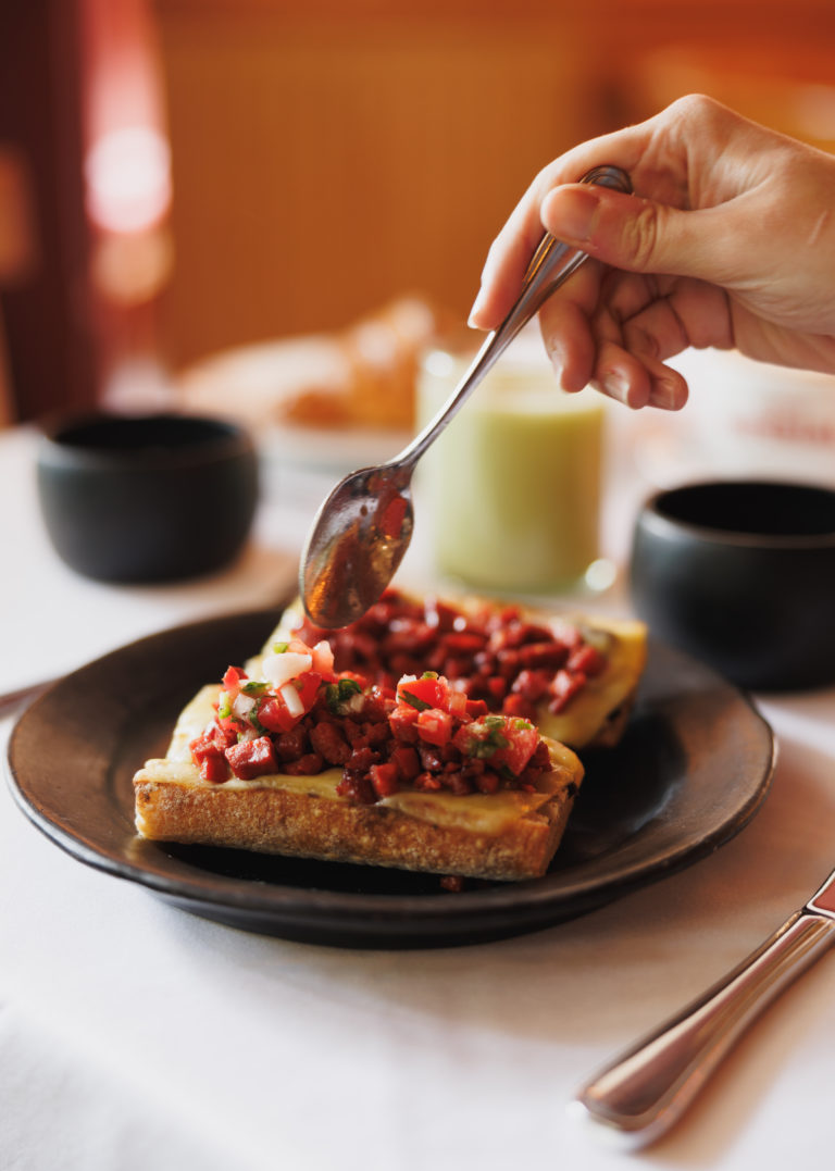 Su menú matutino ofrece una fusión de tradición e innovación con platos como ensalada de manzana asada con queso de cabra, nopal asado con salsa roja y croquetas de huauzontle con mole oaxaqueño, además de clásicos como chilaquiles y enchiladas.