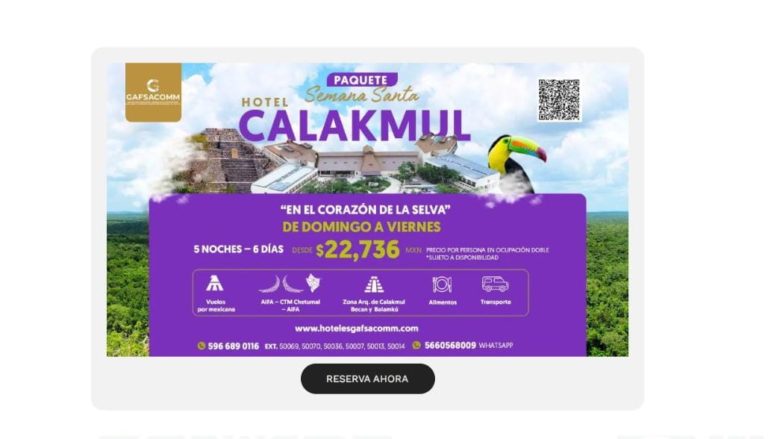 “En el Corazón de la Selva”: Paquete de 5 noches y 6 días desde $22,736 por persona. Incluye visitas a las zonas arqueológicas de Calakmul, Becán y Balamkú.