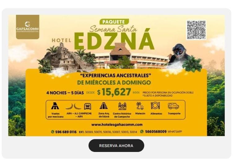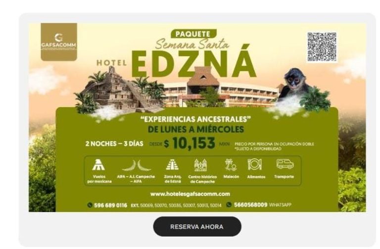 “Experiencias Ancestrales”: Paquete de 2 noches y 3 días desde $10,153 por persona, o paquete de 4 noches y 5 días desde $15,627 por persona. Explora la zona arqueológica de Edzná, el Centro Histórico de Campeche y su malecón.