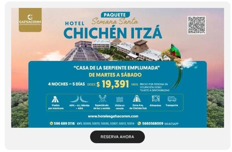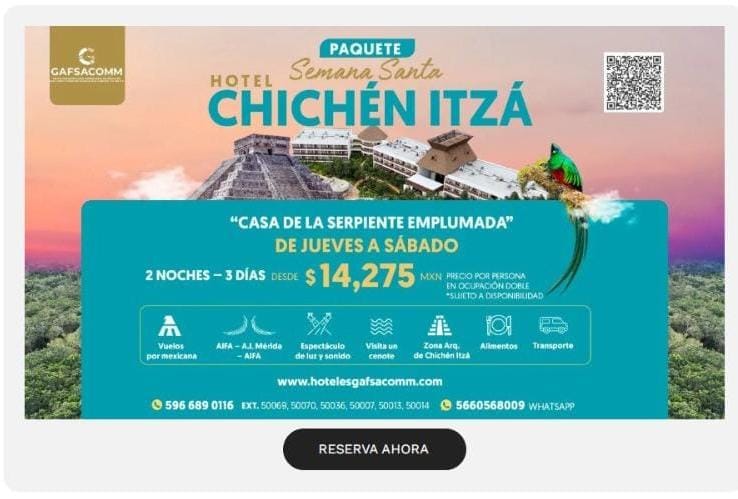Del 11 de abril al 1º de mayo, los Hoteles Tren Maya en la Península de Yucatán ofrecen paquetes turísticos accesibles que incluyen vuelos, traslados, acceso a parques, museos, zonas arqueológicas, hospedaje y alimentos.