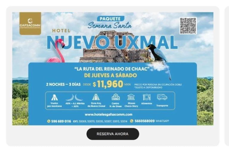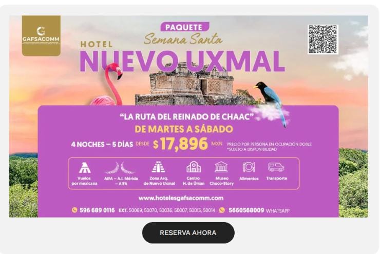 “La Ruta del Reinado de Chaac”: Paquete de 2 noches y 3 días desde $11,960 por persona, o paquete de 4 noches y 5 días desde $17,896 por persona. Incluye visita a la zona arqueológica de Uxmal, el Centro Histórico de Umán y el Museo Choco-Story.