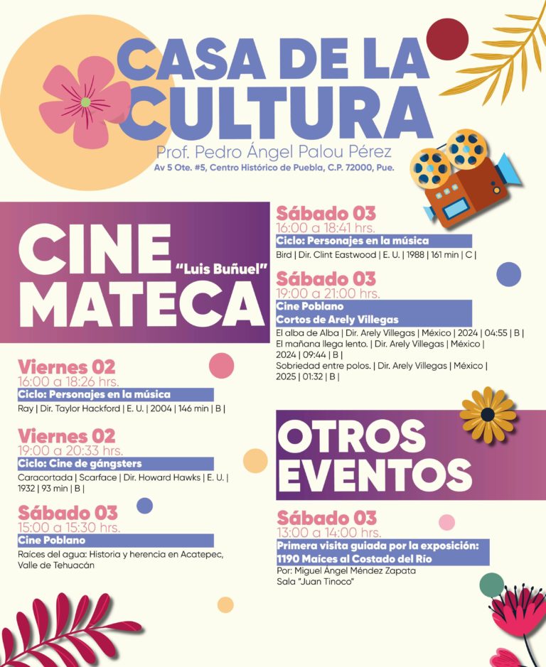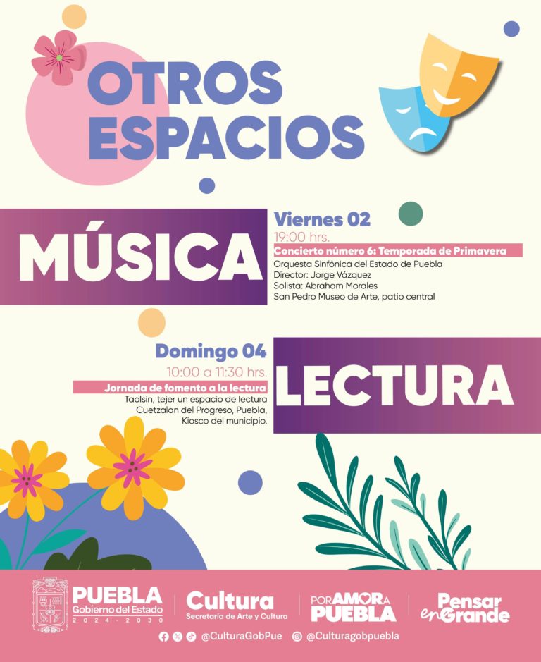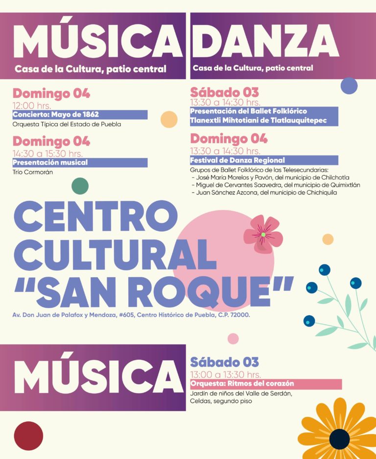 La Secretaría de Arte y Cultura organiza un Festival de Danza Regional el 4 de mayo de 13:30 a 14:30 horas en la Casa de la Cultura, con la participación de tres agrupaciones de Ballet Folklórico de telesecundarias de Chilchotla, Quimixtlán y Chichiquila. Antes del festival, se ofrecerán eventos gratuitos, como el concierto “Mayo de 1862” de la Orquesta Típica del Estado de Puebla y la presentación del Trío Cormorán. Además, el fin de semana habrá exposiciones y proyecciones en la Cinemateca “Luis Buñuel”. Estas actividades buscan promover la cultura y apoyar el talento emergente en Puebla.