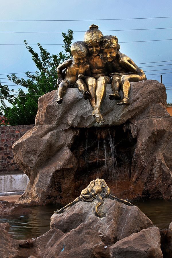 Es única en México y la más grande de su tipo en América. La escultura central, fundida en bronce, muestra a tres niñas observando ranas. El entorno incluye jardineras, pedestales con gárgolas y faroles de cobre, diseñados especialmente para iluminar la plaza central.