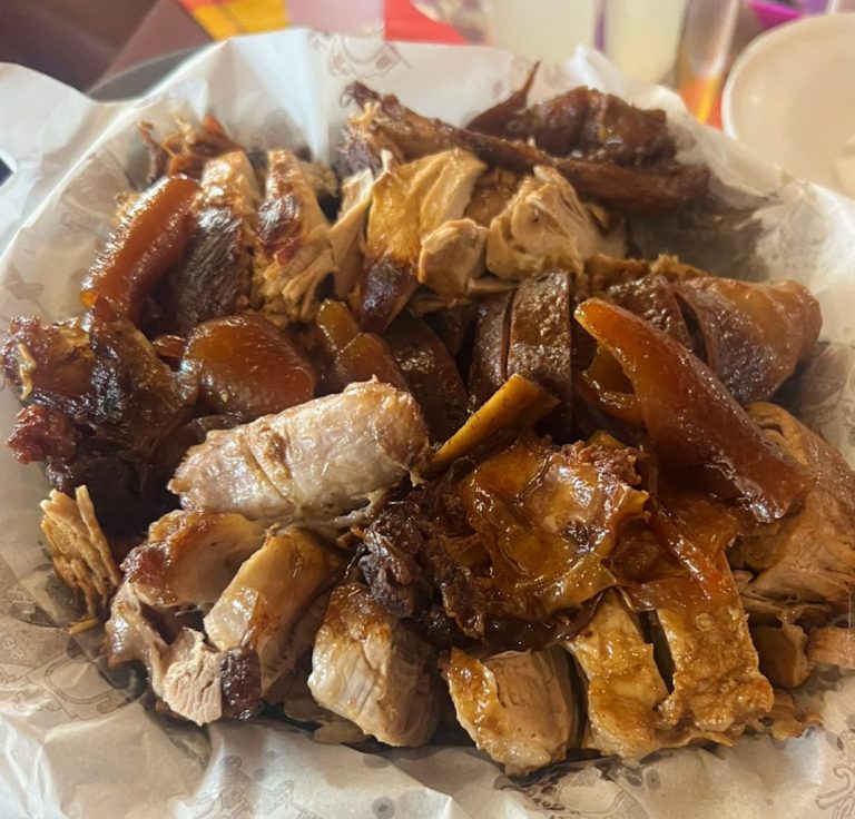 Entre los cortes más populares se encuentran el lomo, la cadera y el codillo, todos preparados con maestría. Otro imperdible del lugar son los tacos de cuerito, servidos en tortillas hechas a mano, cuya preparación artesanal eleva aún más la experiencia culinaria.