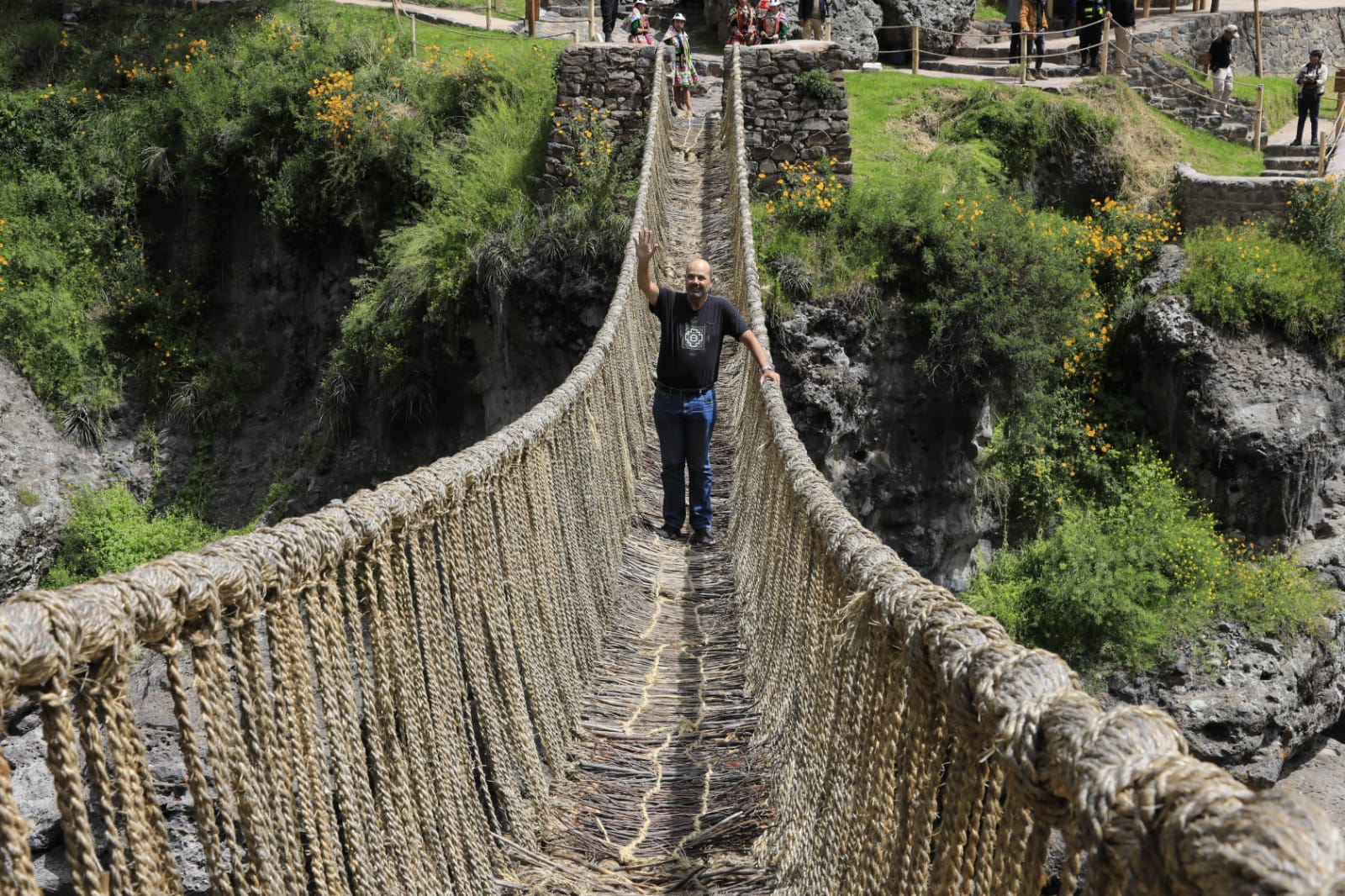 Durante tres días de intenso trabajo, se desmonta el puente viejo y se arma uno nuevo en su lugar. La estructura se forma con seis cuerdas principales: cuatro sirven de base y dos como barandas. Estas son tensadas a lo largo de casi 30 metros, sujetas firmemente a los extremos del cañón donde se encuentran las bases de piedra originales. Aunque el diseño parece simple, requiere de gran habilidad y coordinación. Todo el proceso es guiado por el chakaruwaq, un maestro constructor que supervisa cada detalle y asegura que el puente quede perfectamente ensamblado.