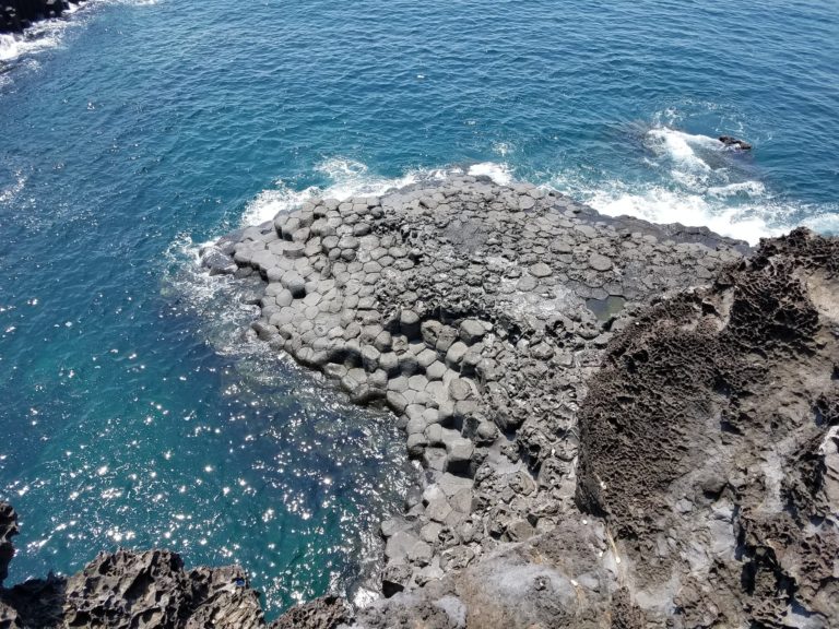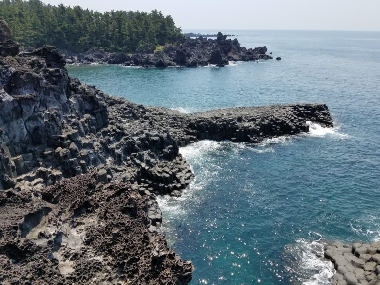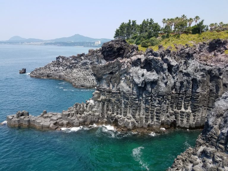 Los Acantilados Jusangjeolli, en la Isla de Jeju, se formaron por el contacto entre la lava del monte Hallasan y el mar, creando columnas basálticas hexagonales. A lo largo de pasarelas con miradores, se pueden apreciar estas formaciones que recuerdan a La Calzada del Gigante en Irlanda, aunque menos impresionantes, junto con vistas únicas de la costa.
