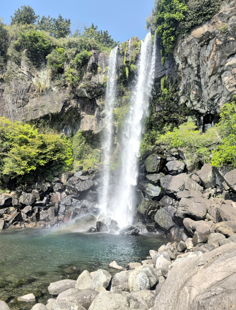 Tras visitar los acantilados Jusangjeolli, se puede llegar en pocos minutos a las Cascadas Cheonjeyeon, conocidas como «El Estanque de Dios». Estas cascadas tienen tres niveles: la primera, de más de 20 metros, destaca por sus paredes hexagonales; la segunda, con más de 30 metros, ofrece un salto de agua caudaloso; y la tercera, menos impactante, se encuentra al final de unas largas escaleras. Entre la segunda y la tercera cascada está el pintoresco Puente Seonim, un arco rojo y blanco decorado con siete ninfas talladas a cada lado.