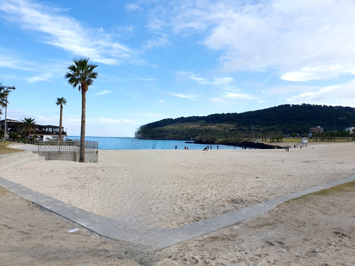 Si llegas temprano al aeropuerto de Jeju, una de las primeras cosas recomendadas es alquilar un coche y recorrer unos 20 km por la costa hasta la playa Hamdeok, al norte de la isla. Esta playa de arena blanca destaca por su agua azul esmeralda y su paisaje volcánico con mucha vegetación. Además de disfrutar la playa, puedes visitar el Café Delmoondo, con vistas privilegiadas, y luego caminar unos 10 minutos hacia una pequeña cala cercana, perfecta para fotos.