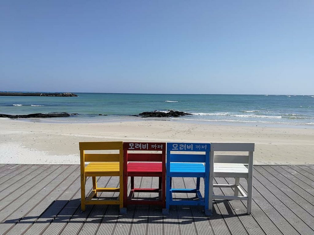La playa Woljeongri, en la costa norte de Jeju, es conocida por sus aguas esmeraldas y arena blanca, además de ser popular entre surfistas por sus buenas olas. Sin embargo, su mayor atractivo es el largo paseo marítimo lleno de elegantes cafeterías como Morebi Cafe, que ofrecen vistas impresionantes al mar y al cielo. En Jeju, como en todo Corea, abundan cafeterías con diseño cuidado y cafés de especialidad, un verdadero paraíso para los amantes del café.