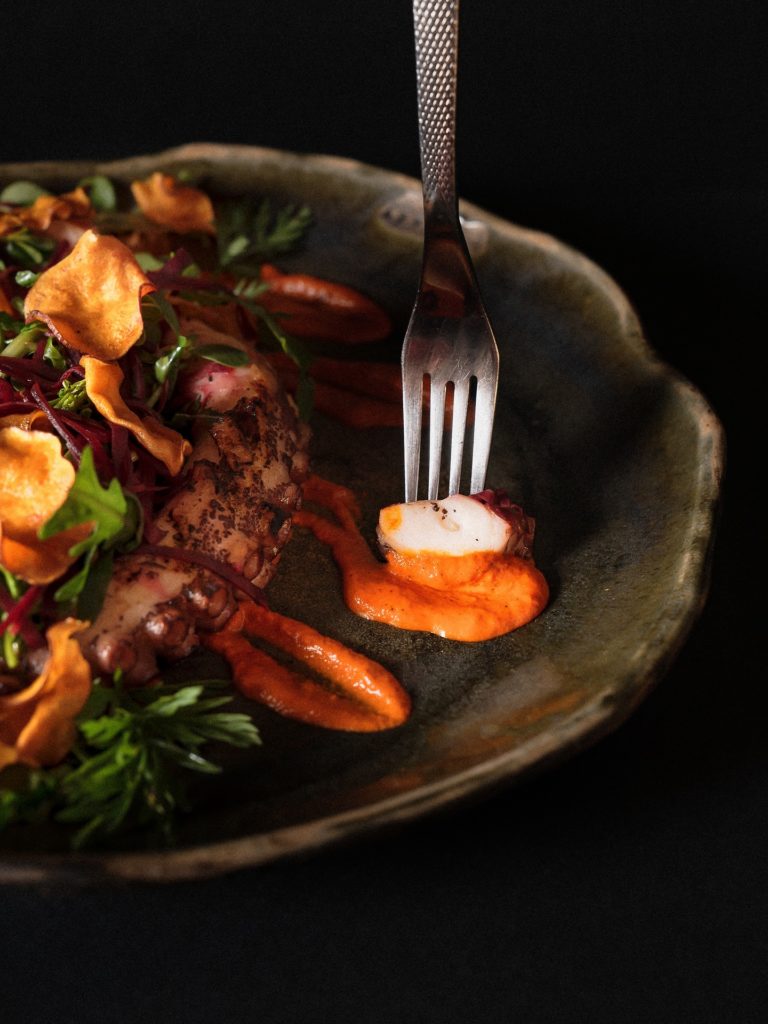 y el pulpo al axiote con pipián en $380 pesos, platillos que son tributos al fuego y a la raíz.