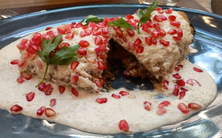 La nogada es densa y generosa, con un toque de dulzura que no empalaga, gracias a la nuez de castilla que se percibe con fuerza y carácter. Se sirve a temperatura precisa, coronada con granada y perejil fresco, como una obra viva en el plato. Cada cucharada es un homenaje al equilibrio: lo dulce, lo salado, lo suave, lo crujiente.