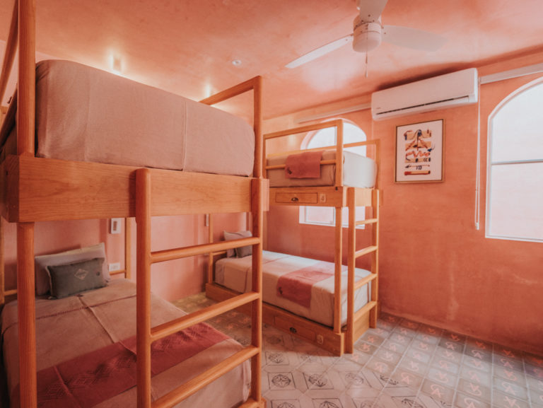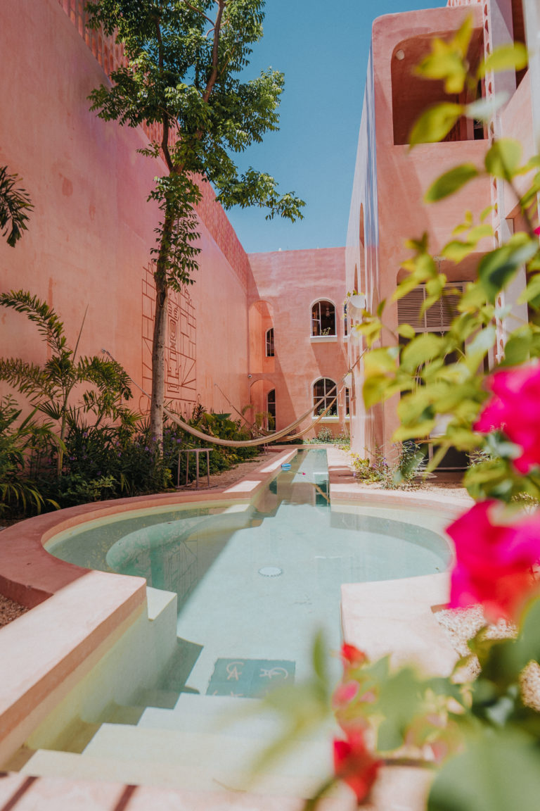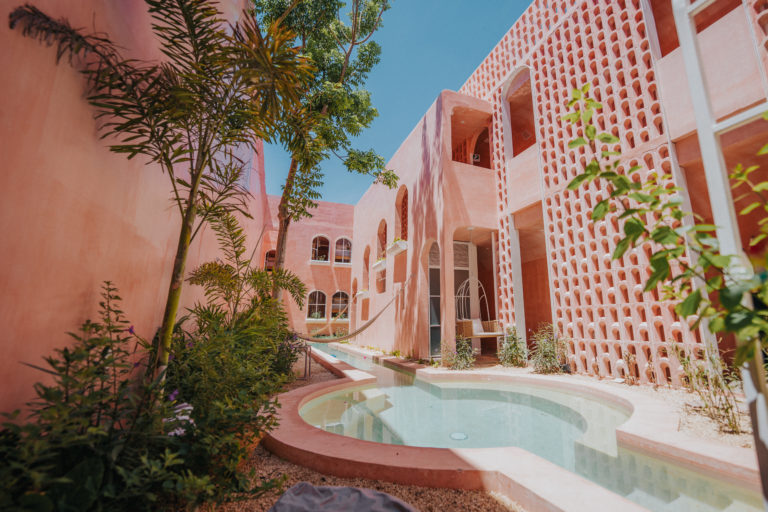 Ubicada en la calle 61, Casa Amate 61 es un hostal premium que celebra la alegría de lo compartido. Su fachada en rosa pastel no pasa desapercibida y es un guiño a la creatividad y a la energía festiva del México tradicional. El edificio de tres niveles alberga:
