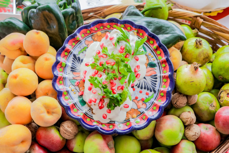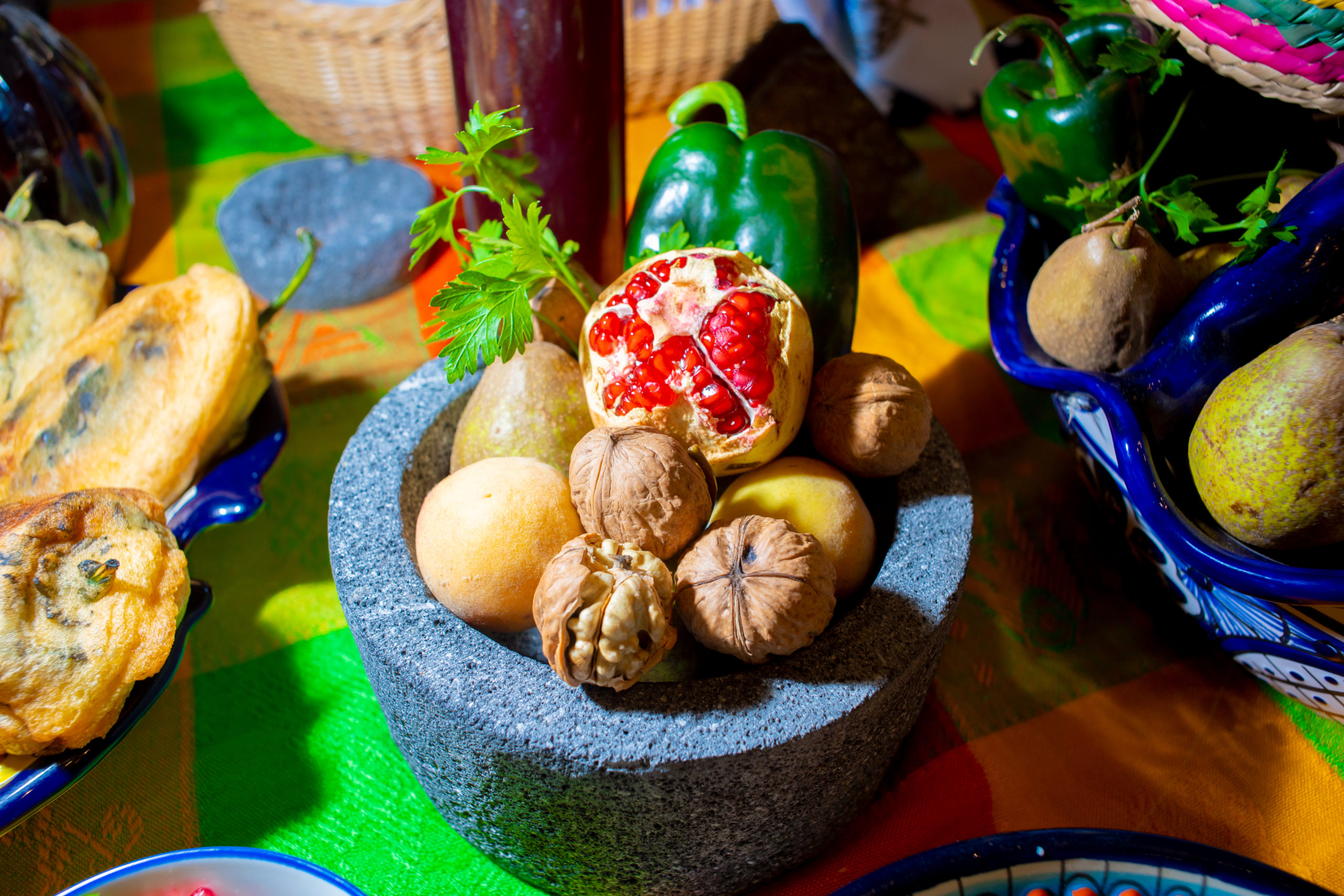 Desde las fértiles tierras de San Andrés Calpan, San Nicolás de los Ranchos, Huejotzingo, Santa Rita Tlahuapan, San Salvador el Verde y Tehuacán, entre otros municipios, emergen los ingredientes que dan vida a esta receta: nuez de castilla, manzana, pera lechera, durazno, granada, perejil y chile poblano, cultivados con amor por manos poblanas.