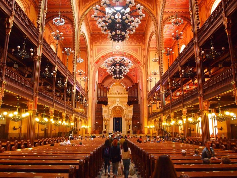 En su interior, la sinagoga puede albergar a más de 3,000 personas. Destaca por su ornamentación riquísima, bancos de madera tallada, candelabros inmensos y un órgano que ha sido tocado por artistas como Franz Liszt. No solo es un lugar de culto, sino también de memoria: en su patio trasero se encuentra el Árbol de la Vida, una escultura con hojas metálicas que llevan grabados los nombres de miles de víctimas del Holocausto.