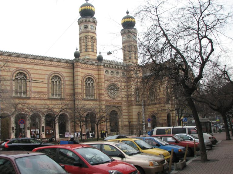 La Gran Sinagoga de Budapest, también conocida como la Sinagoga de la Calle Dohány, es la más grande de Europa y la segunda más grande del mundo. Construida en 1859 en estilo morisco con influencias bizantinas y góticas, su arquitectura exterior de ladrillo rojizo, cúpulas bulbosas y detalles dorados impresiona tanto como su historia.