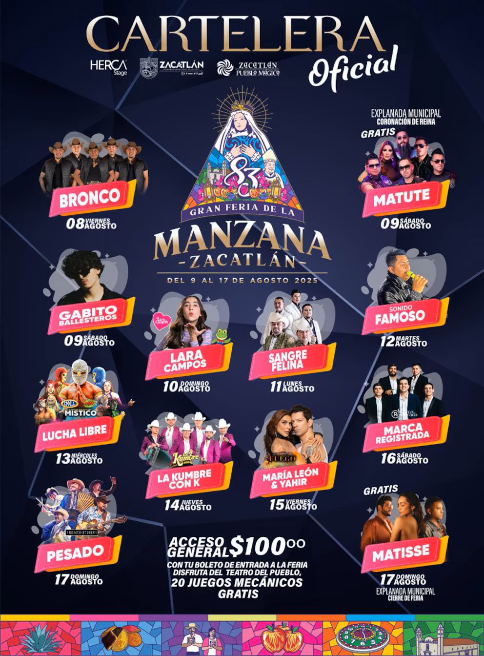 La feria abrirá con la presentación del legendario grupo Bronco, el 8 de agosto, en un arranque que promete nostalgia y energía. Este 9 de agosto, la coronación de Ximena Vera Escobedo, Reina de la Feria, dará paso al show gratuito de Matute y Gabito Ballesteros, fusión de pop, nostalgia y corridos tumbados.