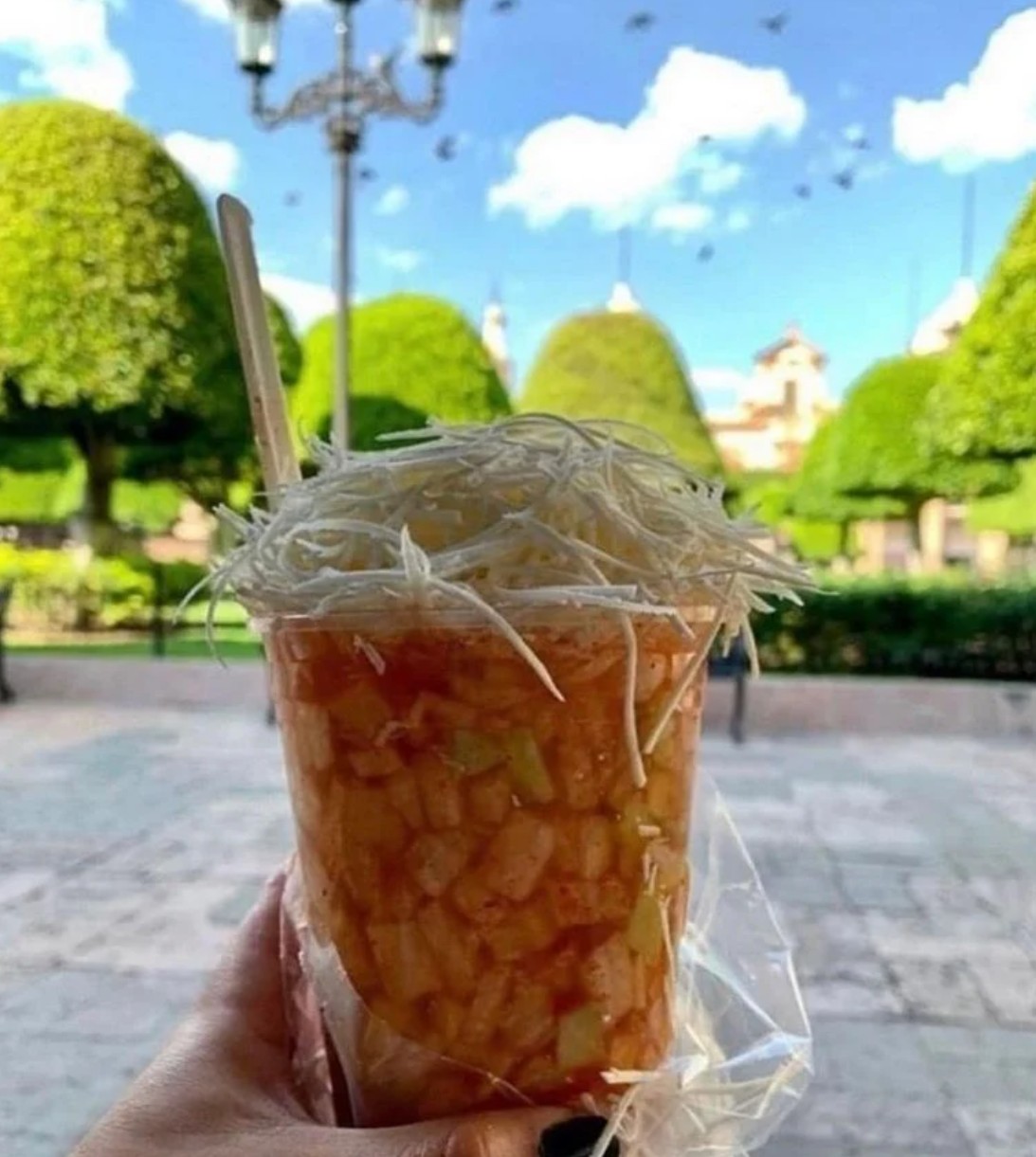 No te dejes engañar por el nombre. Este platillo no es un caldo como tal, sino una botana ácida y refrescante que combina jícama, pepino, cebolla, vinagre, chile, limón y queso rallado. Es perfecto para una tarde calurosa y puedes encontrarlo en “Jícamas Gus” o “Jícamas de León”.