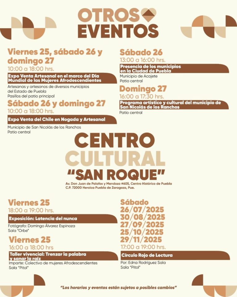 La Secretaría de Arte y Cultura celebra el Día Mundial de las Mujeres Afrodescendientes con una expo venta que reunirá a artesanas y artesanos de todo el estado. Piezas únicas, hechas a mano y con historia, llenarán los pasillos con colores, texturas y tradiciones que enaltecen el legado afro y poblano.