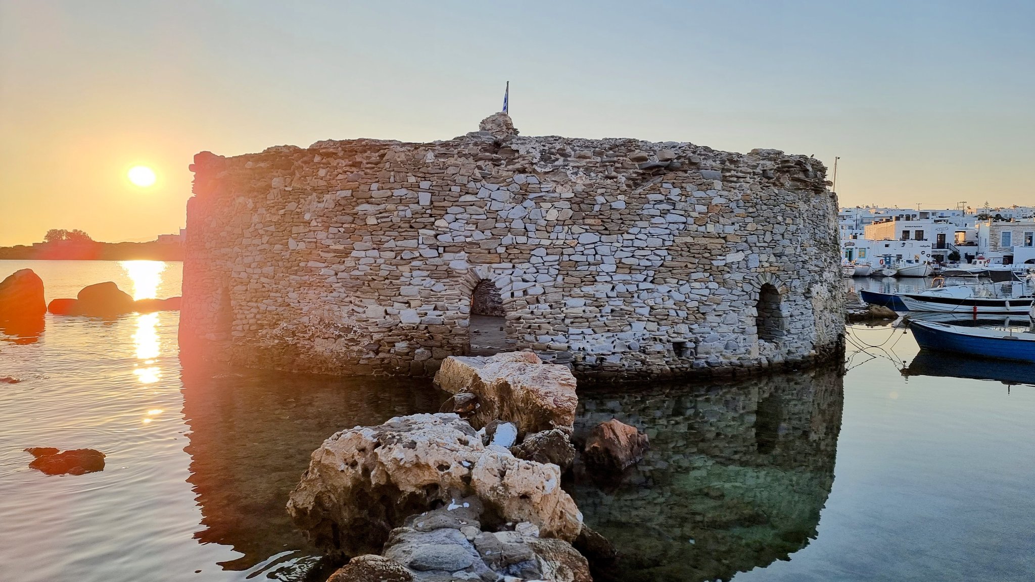 Ubicado justo en el puerto de Naoussa, este pequeño castillo fue construido por los venecianos en el siglo XV como parte del sistema defensivo de la isla. Aunque solo quedan ruinas parciales, caminar entre sus piedras con el mar golpeando suavemente alrededor es toda una experiencia. El contraste entre el castillo antiguo y los cafés modernos del puerto crea una atmósfera única. Es un sitio muy fotogénico, sobre todo al atardecer, cuando la luz baña el lugar con tonos dorados y el puerto cobra vida con música y risas.