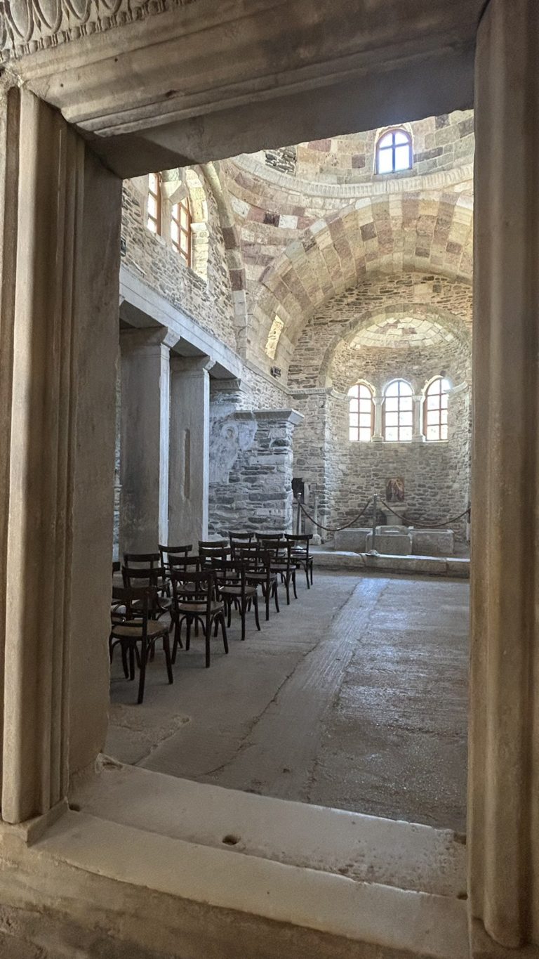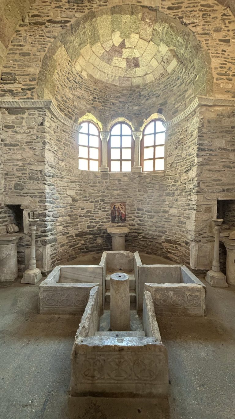 Considerada una de las iglesias más importantes de Grecia, Panagia Ekatontapiliani está en el corazón de Parikia. Su historia se remonta al siglo IV, lo que la convierte en un lugar sagrado y lleno de significado. Su nombre significa “la iglesia de las cien puertas”, aunque no todas son visibles. Es un complejo que combina sencillez exterior con una atmósfera interior profundamente espiritual. Además de la arquitectura, destacan sus frescos, su baptisterio paleocristiano y el silencio que invita a la reflexión. Visitarla es conectar con siglos de historia viva.