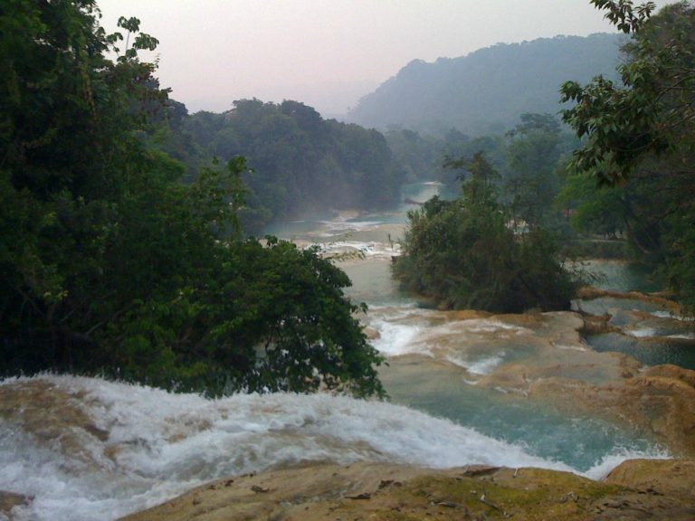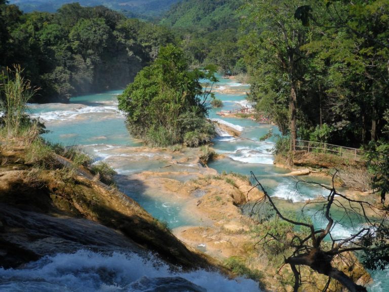 En el corazón de la selva chiapaneca, donde el verde lo envuelve todo y el aire huele a tierra viva, las Cascadas de Agua Azul brotan como un suspiro de la naturaleza más pura. Su nombre no es casual: el río fluye en tonos turquesa, como si el cielo hubiera caído en gotas sobre la piedra. Este color hipnótico se debe a los minerales que viajan disueltos en sus aguas, pintando el paisaje con una intensidad difícil de olvidar.