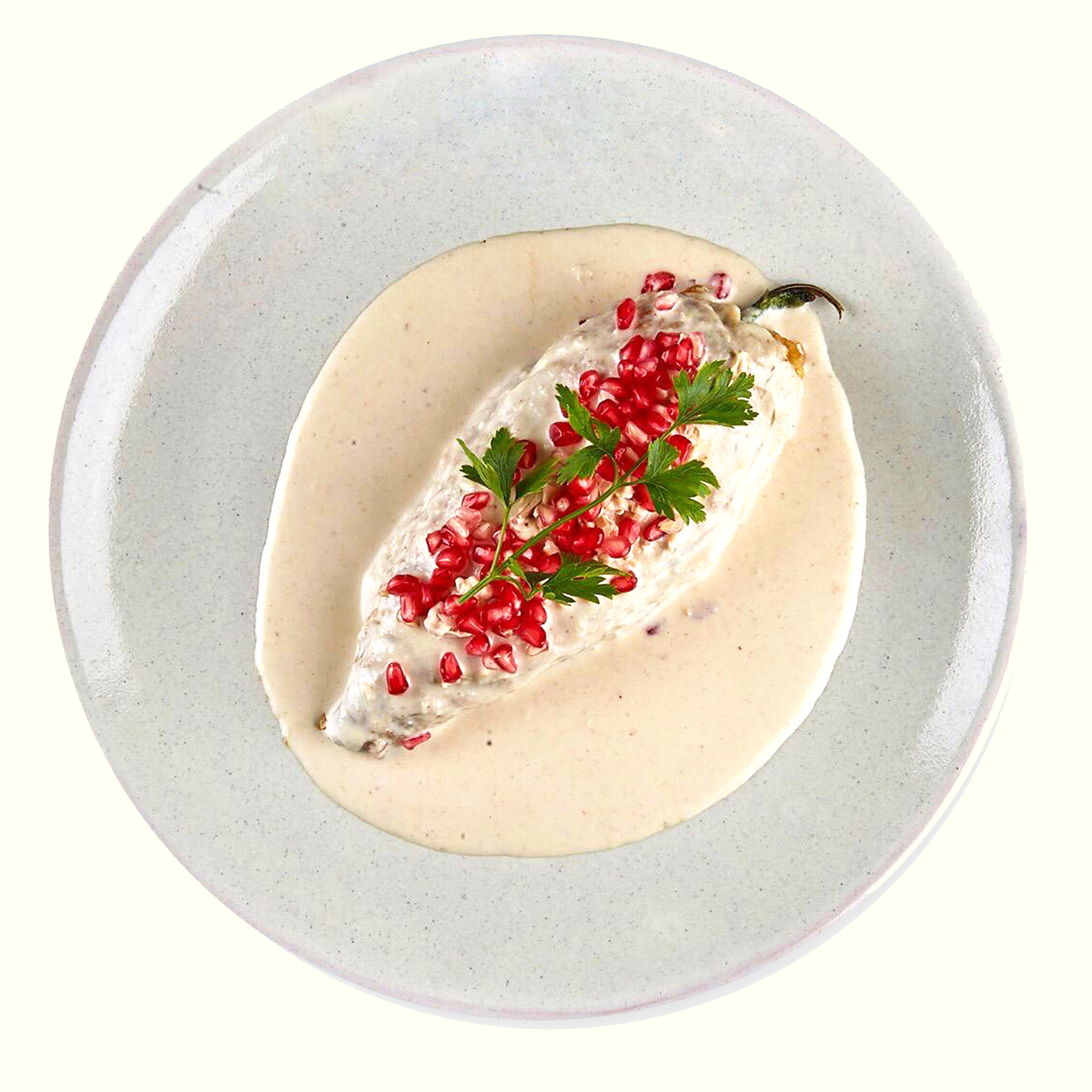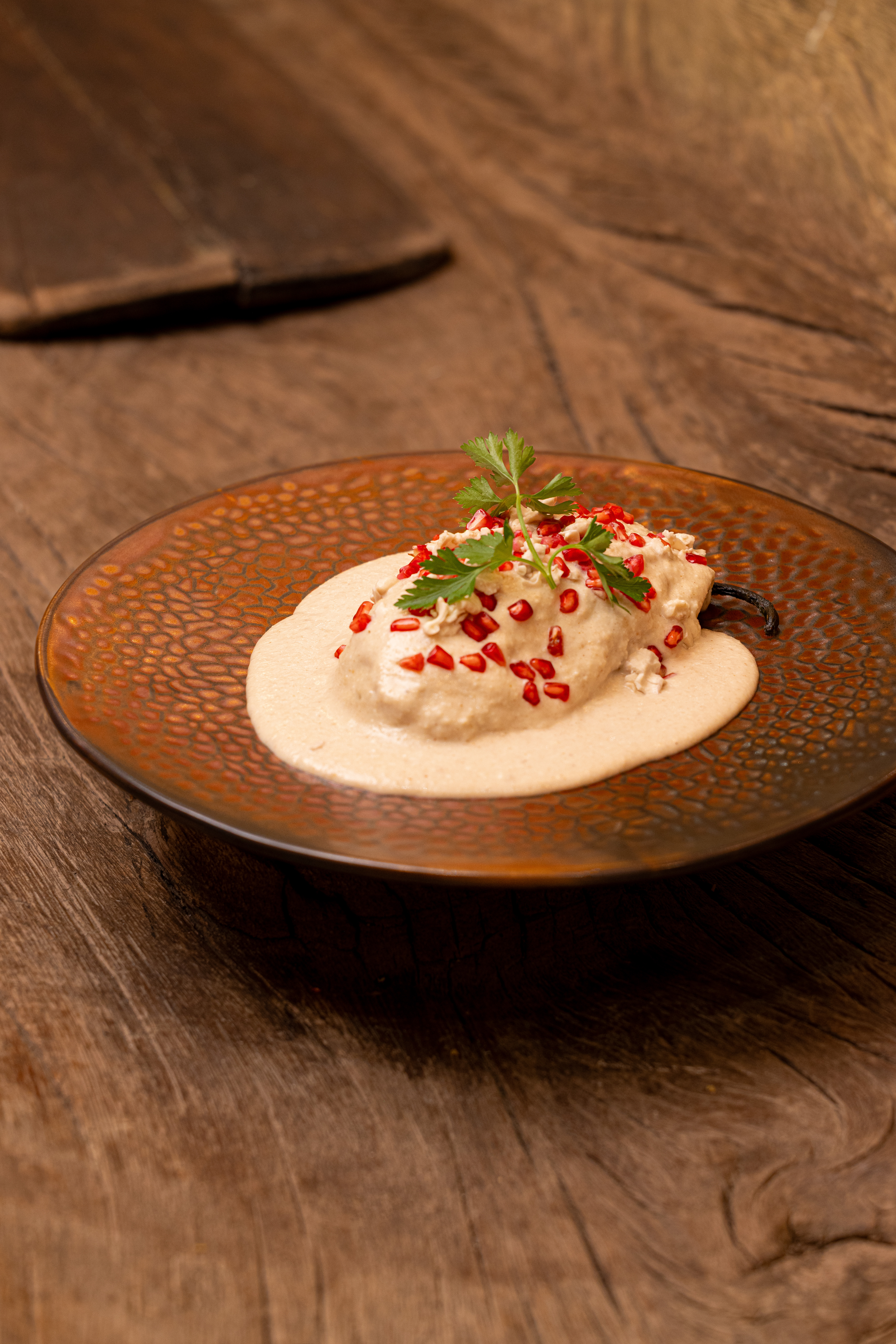Cada parte ha sido elegida con cuidado: frutas frescas de temporada, carne sazonada con recetas de antaño, especias tradicionales y una nogada cremosa con nuez de Castilla recién cosechada. Todo presentado con el esplendor barroco del platillo original y acompañado por la técnica impecable del chef Lazcarro, que logra un equilibrio perfecto entre lo dulce, lo salado y lo crujiente.