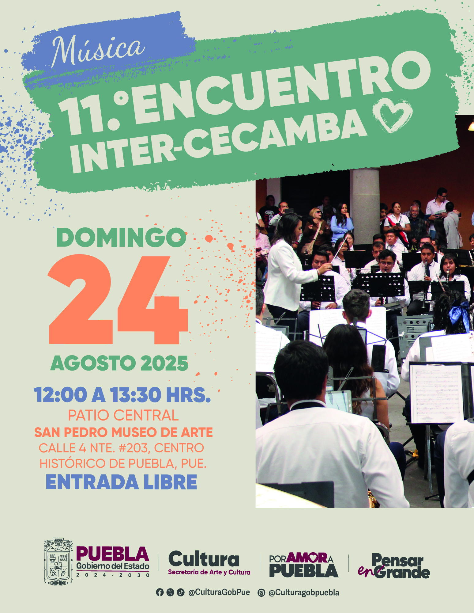 La Secretaría de Arte y Cultura de Puebla realizará el 11° Encuentro Inter-CECAMBA el 24 de agosto en el patio central de San Pedro Museo de Arte. El concierto contará con más de 120 niñas, niños y jóvenes de 8 a 17 años, provenientes de diversos CECAMBA del estado.