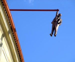 La escultura “Hombre pasando el rato” (Man Hanging Out) es una de las obras más curiosas y desconcertantes del artista checo David Černý. Ubicada en una calle del casco antiguo de Praga, esta escultura muestra a un hombre —que representa a Sigmund Freud— colgando de una mano desde lo alto de un edificio, como si estuviera al borde de caer. A primera vista, muchos transeúntes creen que es una persona real, lo que provoca reacciones sorprendidas e incluso de alarma.