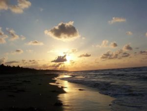 La playa está bordeada por una extensa franja de arena dorada y suave, mientras que el mar, de oleaje moderado, ofrece un espectáculo natural relajante, especialmente durante los atardeceres.