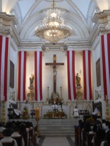 En su interior, el altar mayor es uno de los elementos más llamativos, decorado con mármol y detalles dorados. También hay obras de arte sacro, retablos y vitrales que le dan un ambiente solemne y tranquilo.