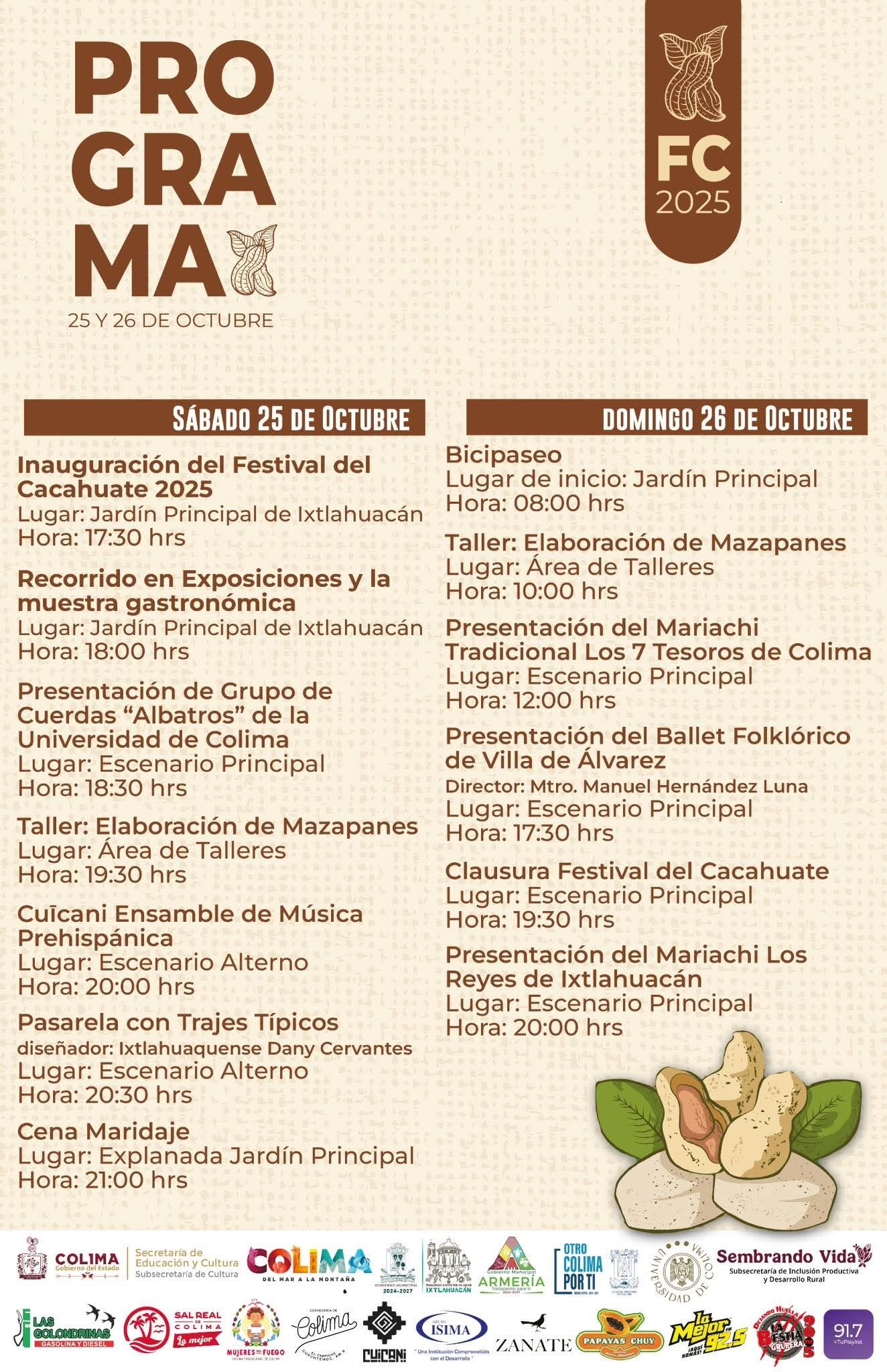 El sábado 25 de octubre, a las 5:30 de la tarde, se llevará a cabo la inauguración oficial. Después, los asistentes podrán recorrer las exposiciones y la muestra gastronómica. Para darle más dinamismo al festival, habrá presentaciones de la Rondalla de la Universidad de Colima, un taller de elaboración de mazapanes, el Cuícaní Ensamble de Música Prehispánica y una pasarela de trajes típicos a cargo del diseñador ixtlahuaquense Dany Cervantes. La jornada finalizará con la cena maridaje en la explanada del jardín principal, donde se degustarán platillos con cacahuate acompañados de bebidas artesanales.