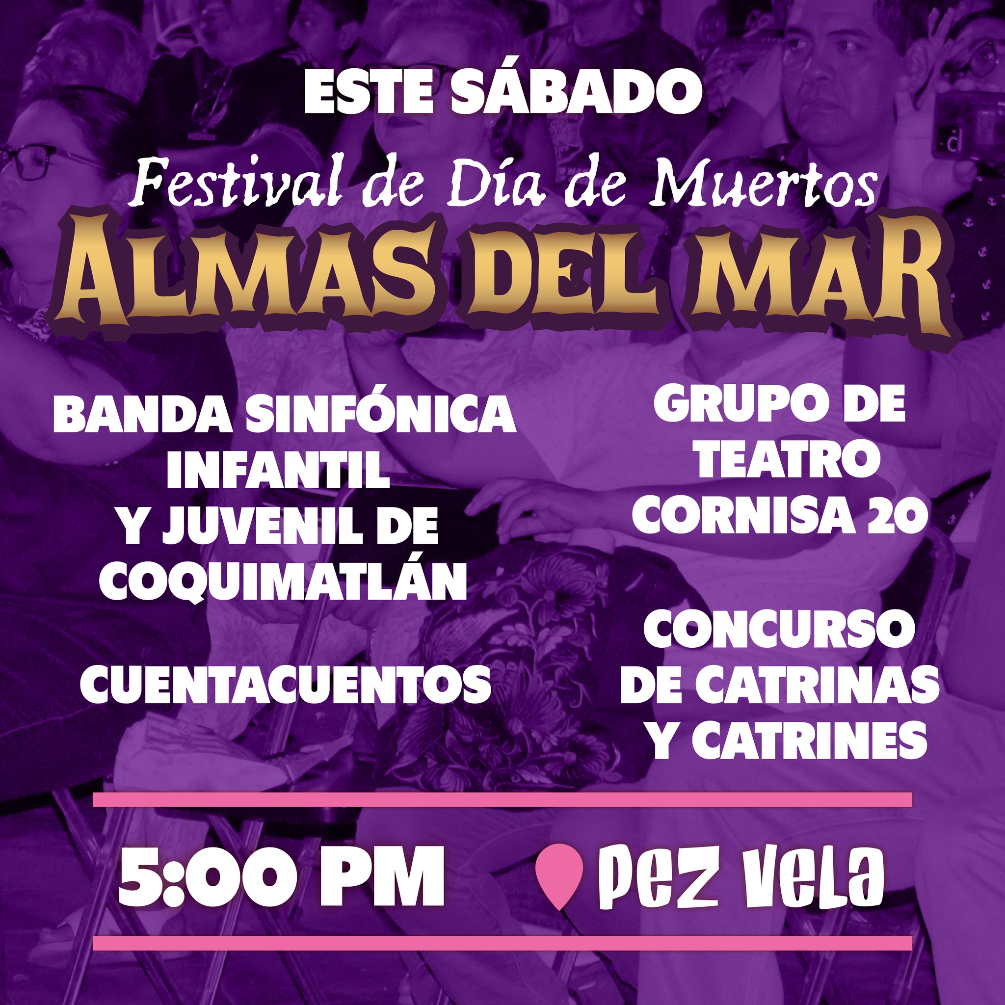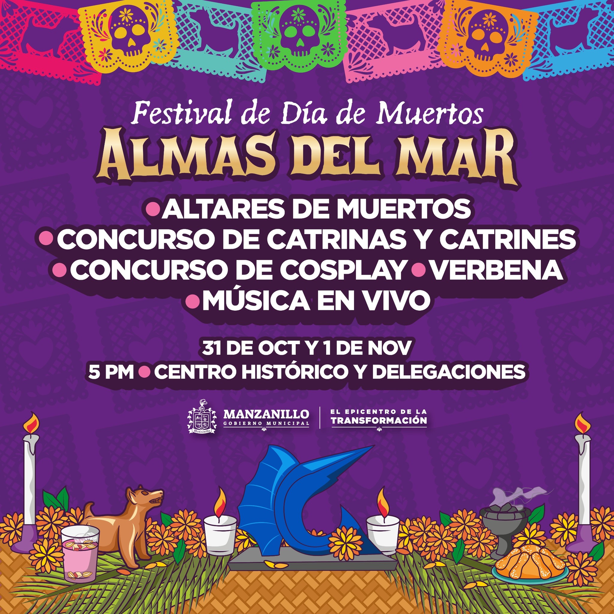 Entre los eventos destacados está el Concurso de Catrinas y Catrines, con categorías infantil y adultos, que se realizará el 1 de noviembre a las 19:00 h en el Centro Histórico de Manzanillo. Los participantes podrán lucir su creatividad en un ambiente familiar lleno de música, color y tradición.