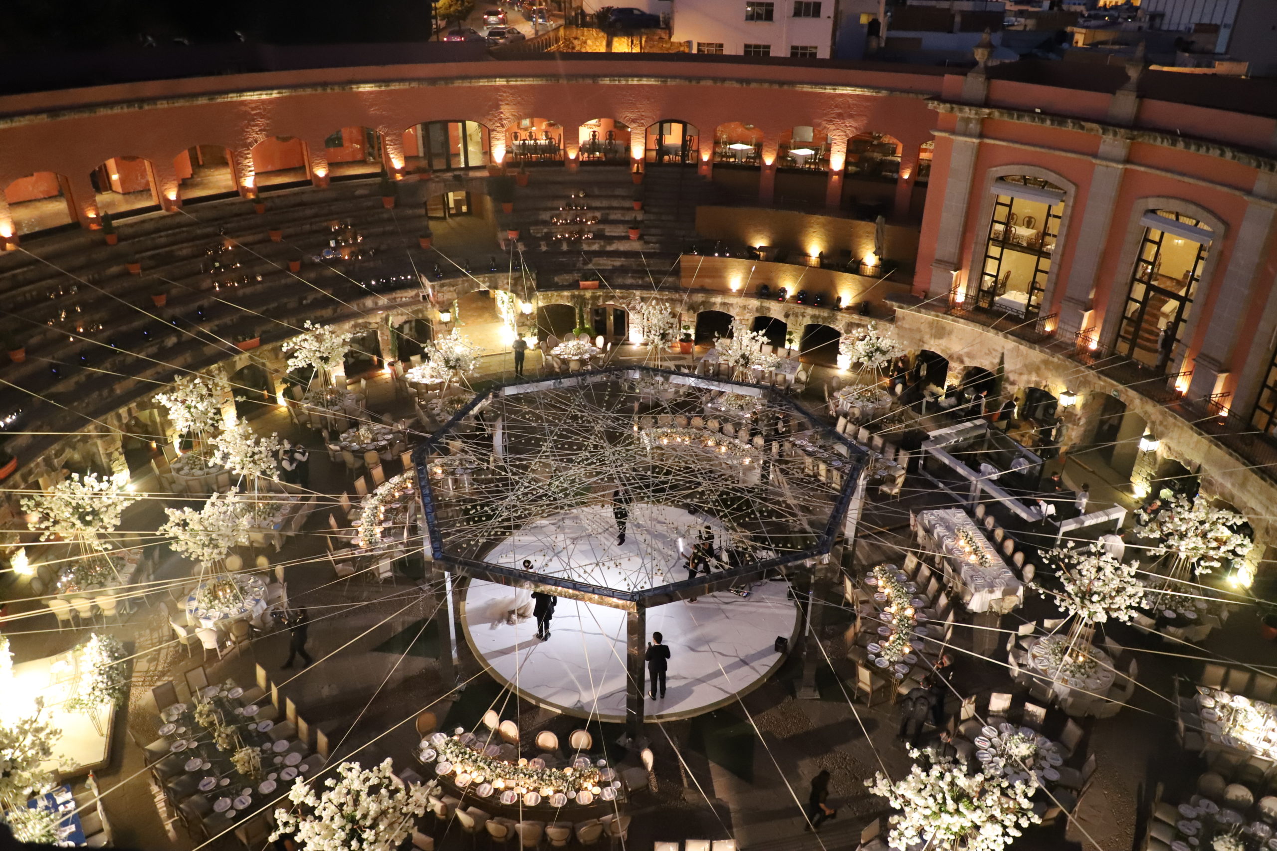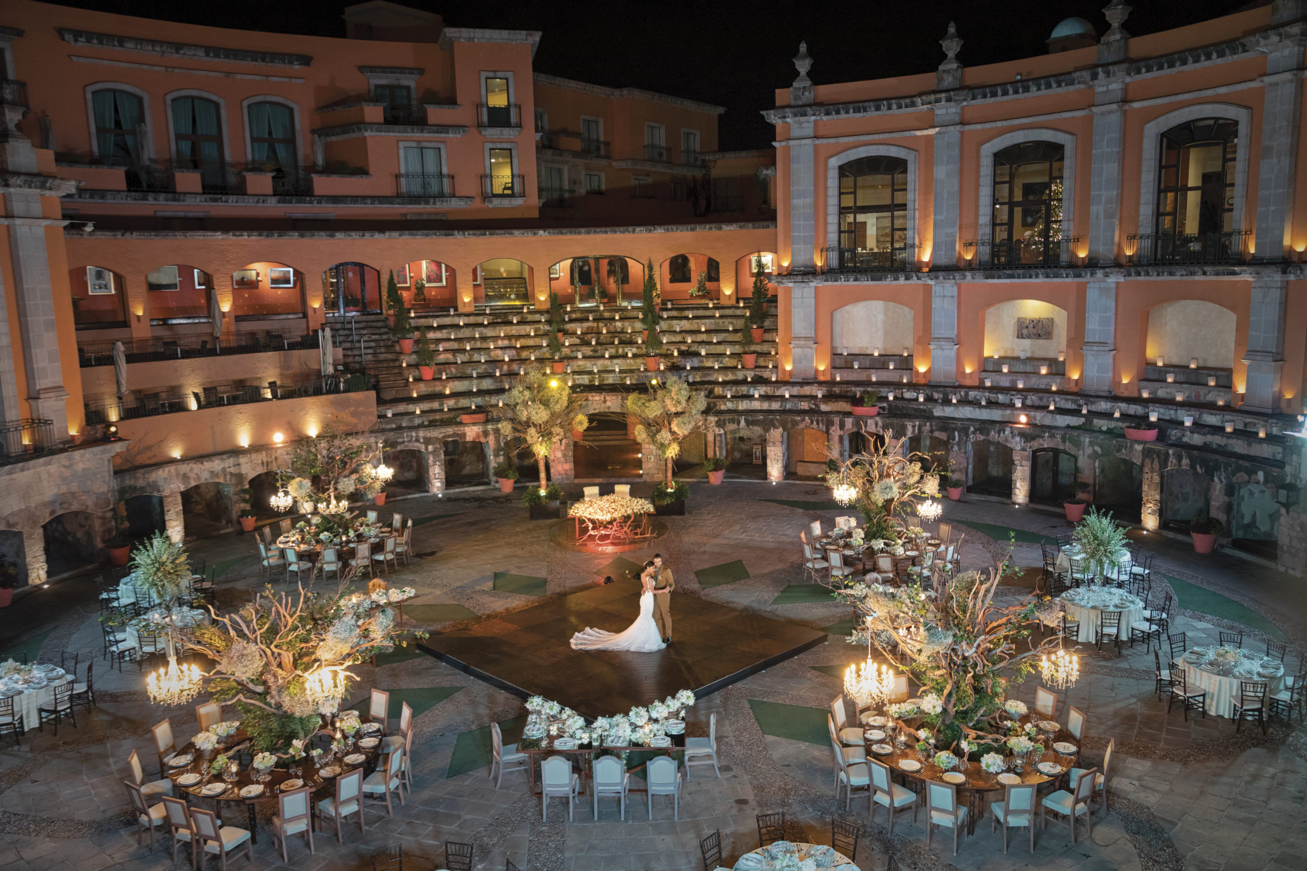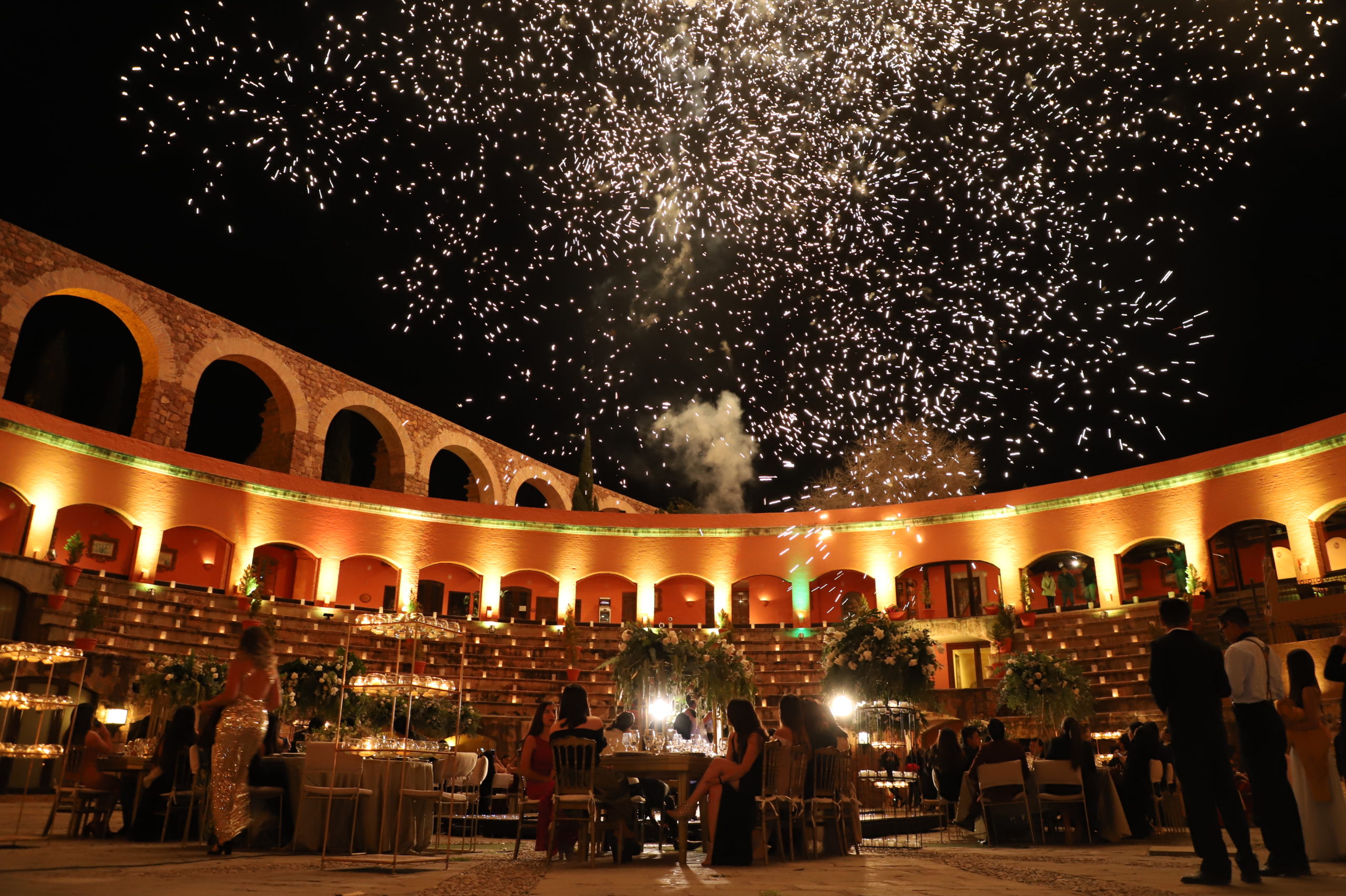 El Hotel Quinta Real Zacatecas, uno de los sitios más emblemáticos de la ciudad, ofrece un escenario incomparable: una antigua plaza de toros convertida en un elegante patio colonial adornado con flores y adoquines. Su amplitud y diseño permiten adaptarlo a diferentes estilos y tamaños de evento, por lo que resulta perfecto para bodas con numerosos invitados que buscan un ambiente distinguido y lleno de historia.