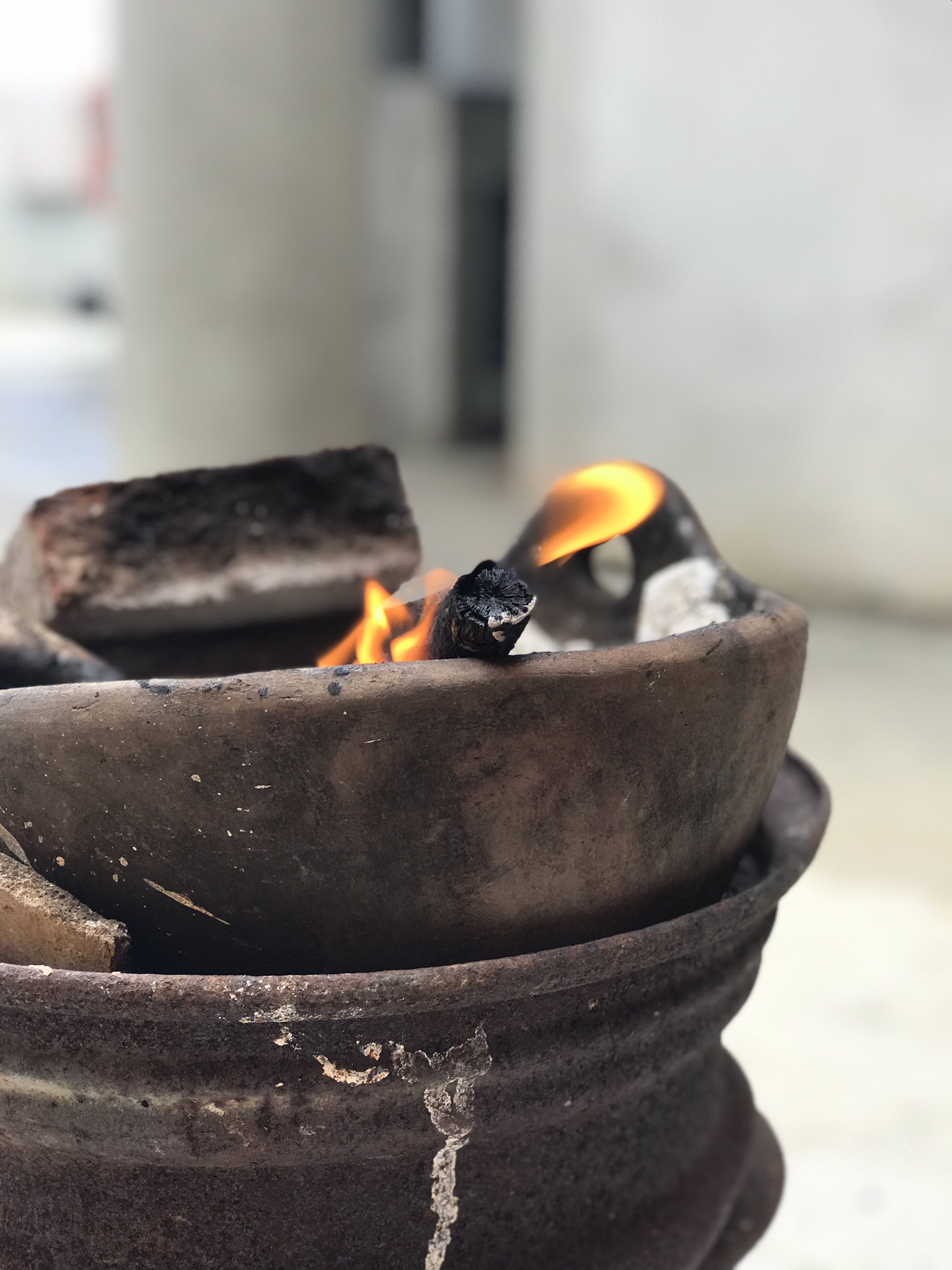 El ritual comienza al encender el brasero. Debajo del comal, se coloca el cuenco de barro en donde se cocinará el machucado. Mientras se nixtamaliza el maíz que, pacientemente, será molido en metate como marca la costumbre ancestral.