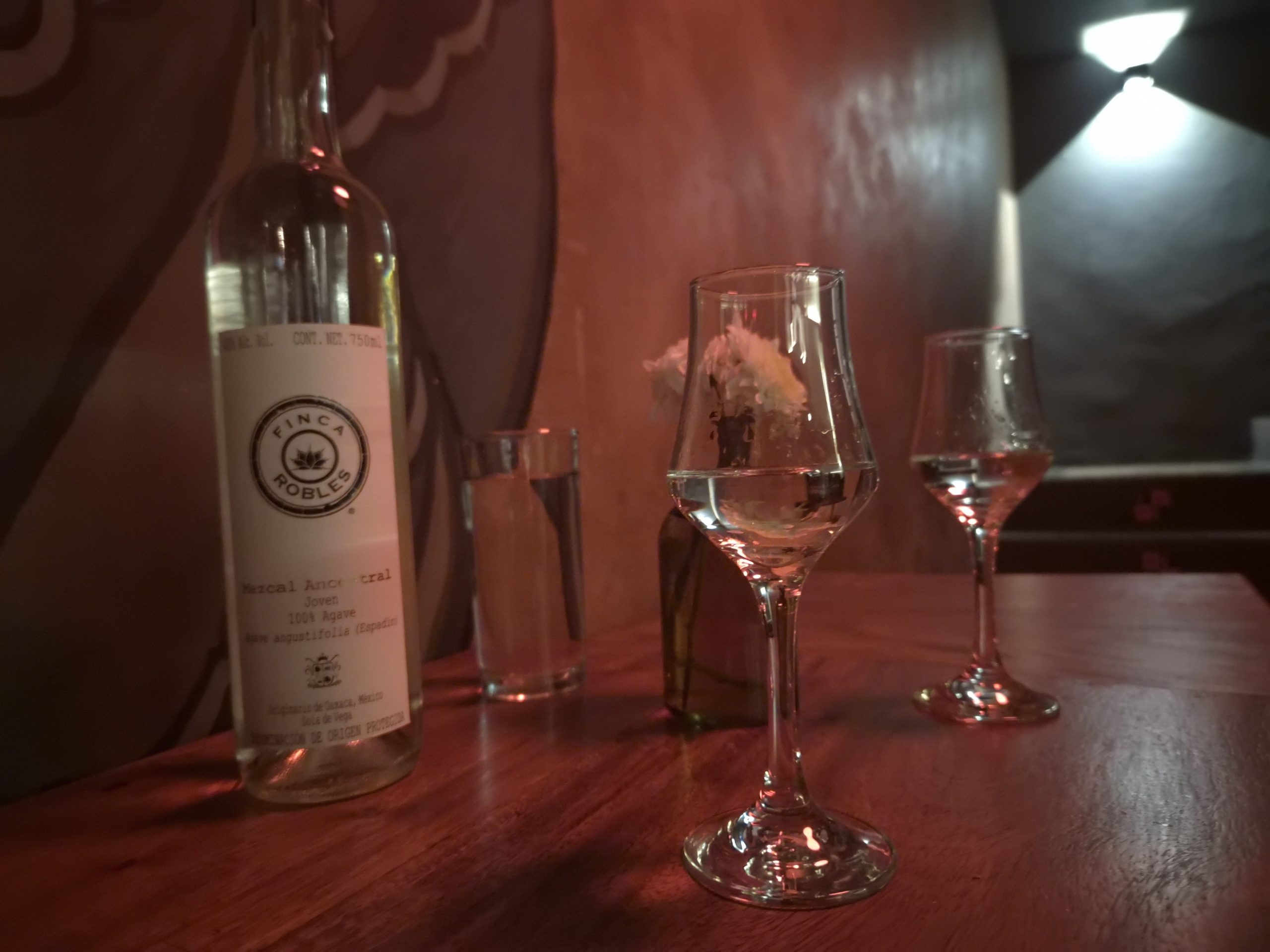 La barra tiene más de 20 etiquetas de diferentes regiones, incluyendo variedades como espadín, tobalá, jabalí, tepeztate y ensambles. También realizan catas sensoriales para comparar diferentes tipos de mezcal sin necesidad de moverse por todo el país, ayudando al comensal a saborear las diferencias según el maguey y el clima.