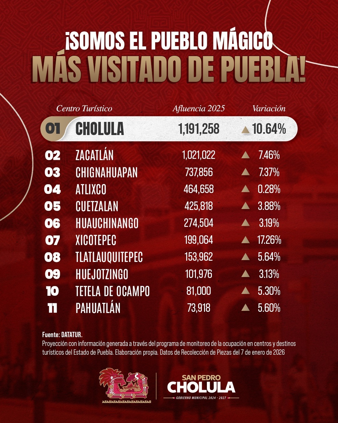 Durante el último año, Cholula recibió a 1 millón 191 mil 258 visitantes que llegaron atraídos por su arquitectura histórica, su variada oferta gastronómica y la infraestructura hotelera que atiende tanto al turismo nacional como al internacional.