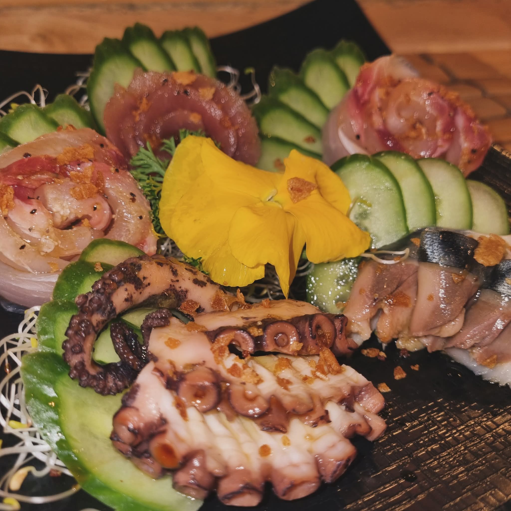 Cada detalle importa. El sashimi, por ejemplo, se limpia y purifica con sal y sake antes de servirse, una enseñanza que el chef aprendió desde niño junto a su abuela en los mercados. Para él, el pescado merece respeto y cuidado, no todo se usa y todo debe tratarse con atención.