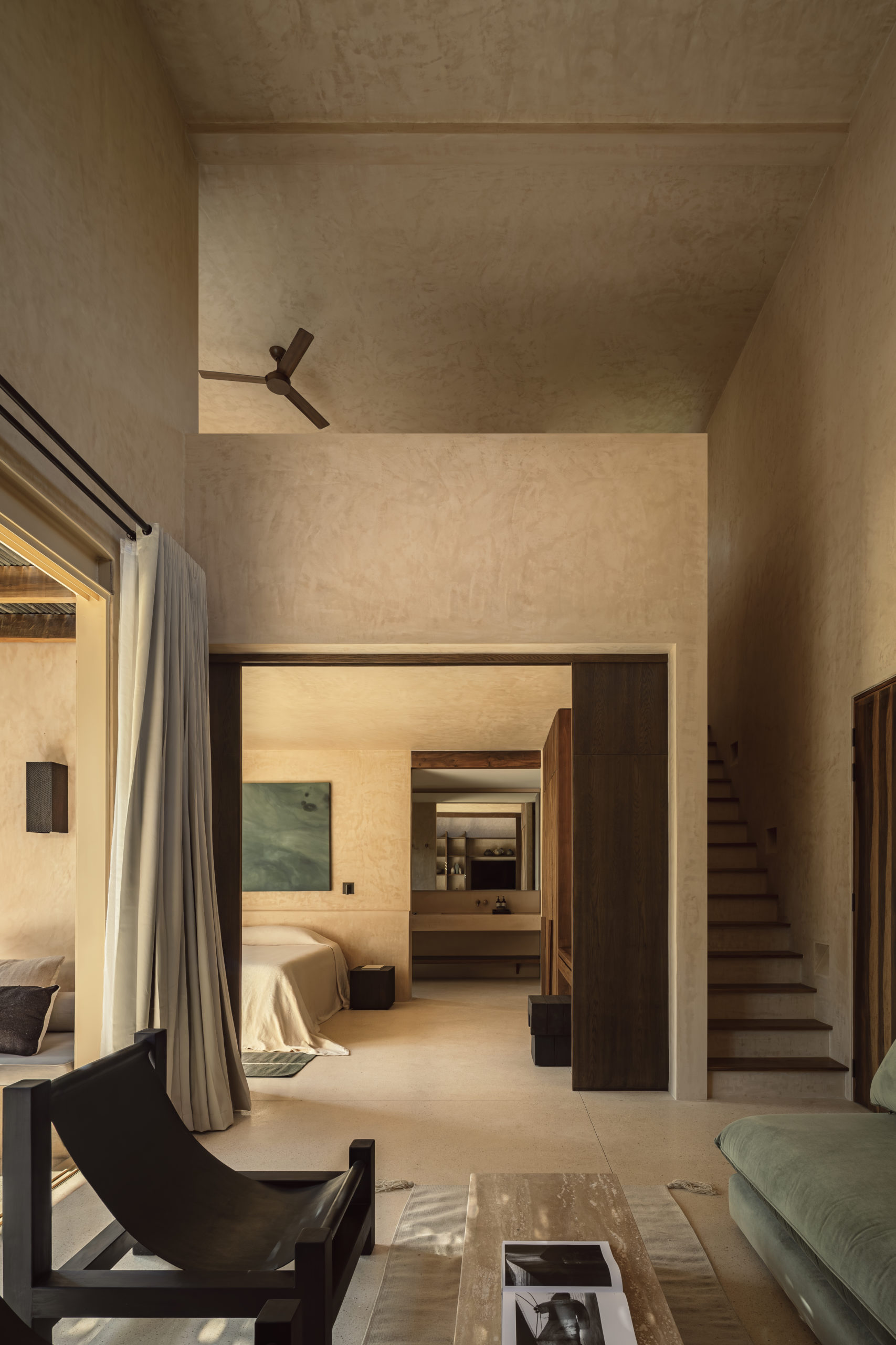 En el interior, cada rincón refleja una mezcla cuidada de artesanía y diseño contemporáneo. Tapetes de Oaxaca, cerámicas de Escarabajo, lámparas de Nuumbra, textiles de Caralarga y piezas de carpintería artesanal crean un ambiente íntimo, elegante y lleno de sensibilidad.