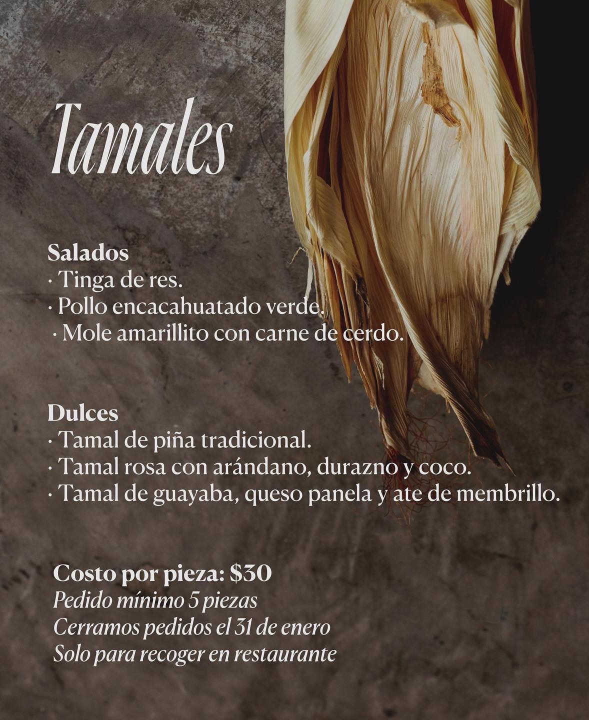 Tamales clásicos (mole, verde, dulce) y otros como chamorro o cochinita pibil. A 25 pesos la pieza, con paquetes que incluyen champurrado (6 tamales + 1 litro por 230, por ejemplo). Buena opción para llevar a casa o compartir.
