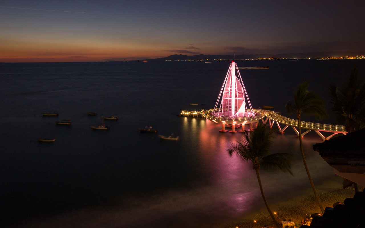El Muelle de Playa Los Muertos es uno de los íconos más reconocidos de Puerto Vallarta, Jalisco. Inaugurado en 2013 tras una renovación importante, este muelle (también llamado mirador) se extiende sobre el mar con una estructura moderna en forma de vela o velaria que se ilumina con colores vibrantes por la noche. Diseñado por el arquitecto José de Jesús Torres Vega, mide alrededor de 100-150 metros hacia el océano y ofrece un paseo peatonal gratuito con bancas para disfrutar la vista, el atardecer y el ambiente animado de la Zona Romántica.