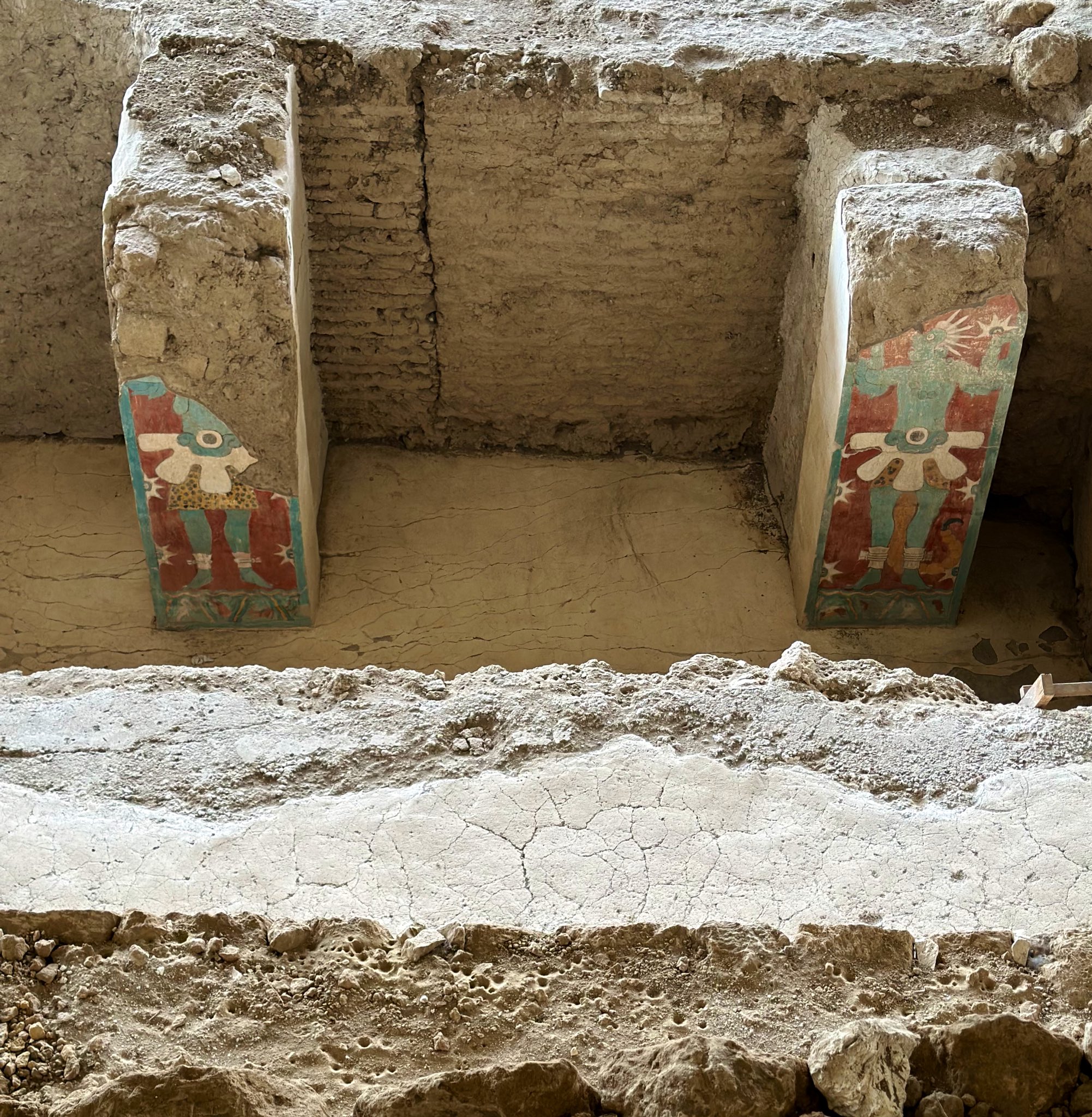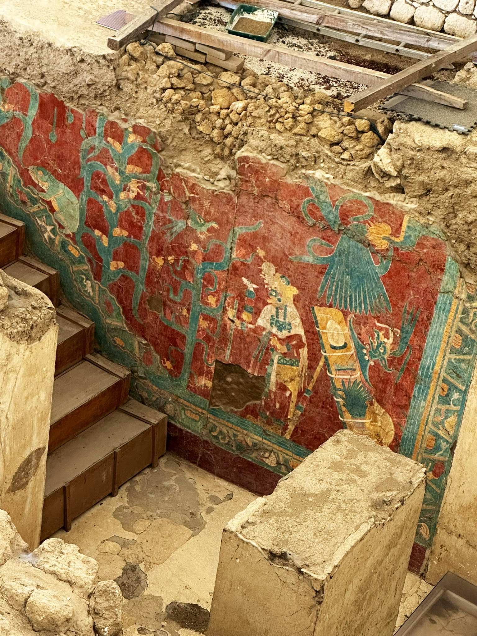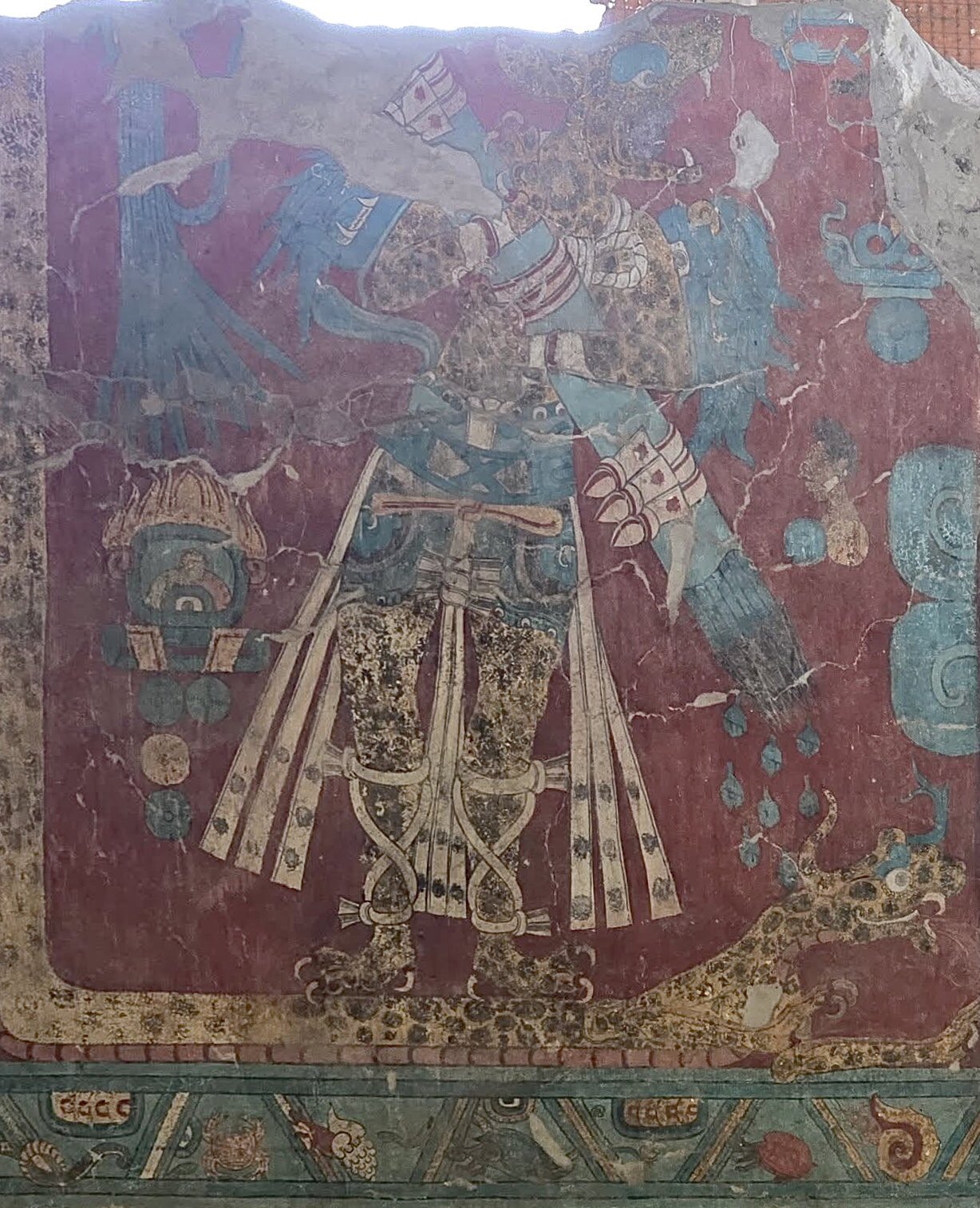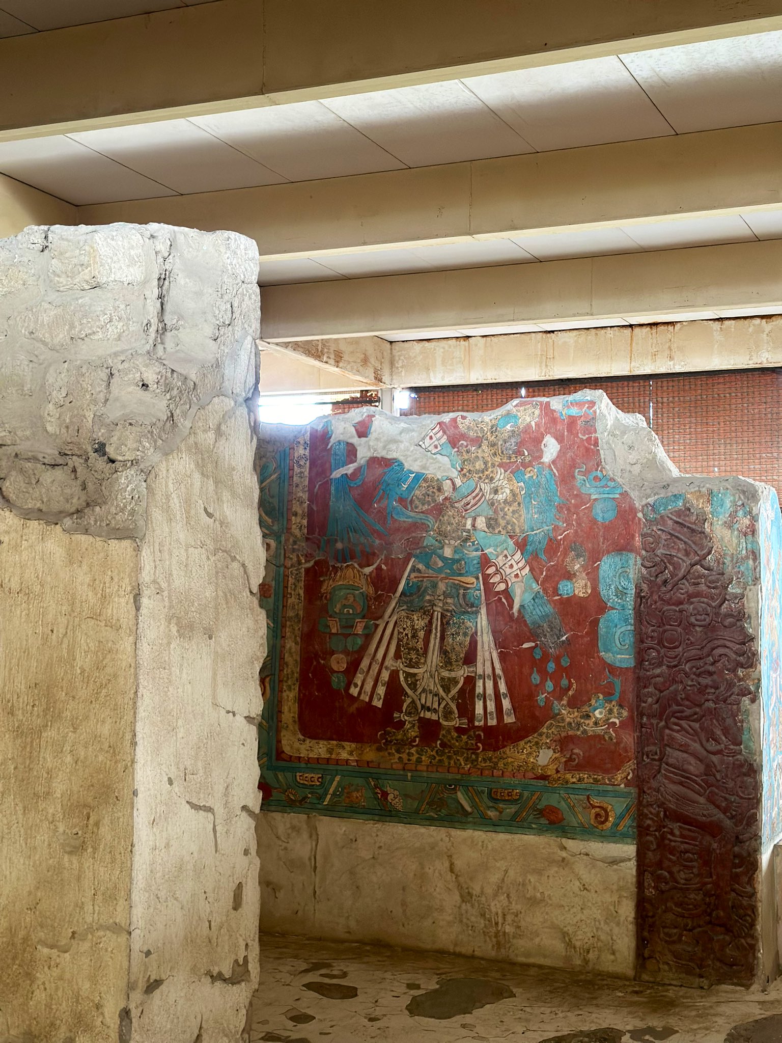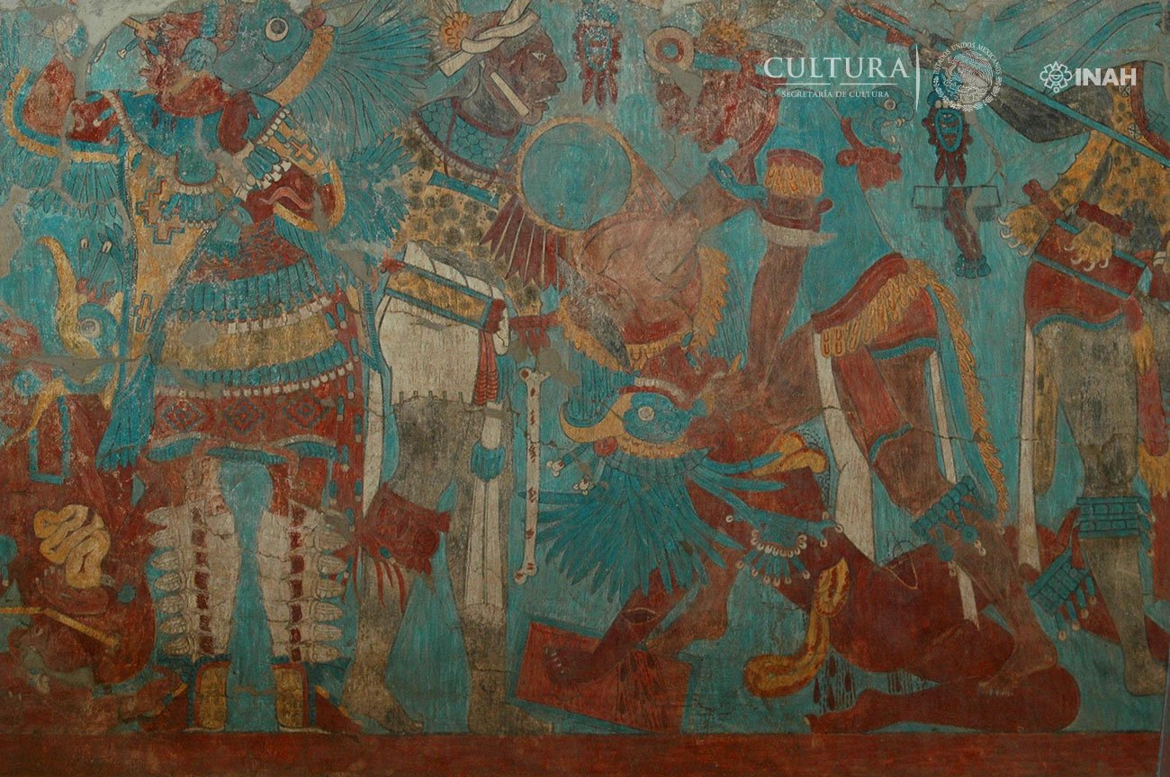 Construyeron el Gran Basamento: un montículo enorme con etapas superpuestas, plataformas, adoratorios y pirámides. Cada generación añadía encima de la anterior, como capas de una torta histórica. Ahí pintaron murales brutales: el de la Batalla, el Hombre Jaguar, el Guerrero Águila, el Templo Rojo… colores vivos, influencias mayas, teotihuacanas, del Golfo.